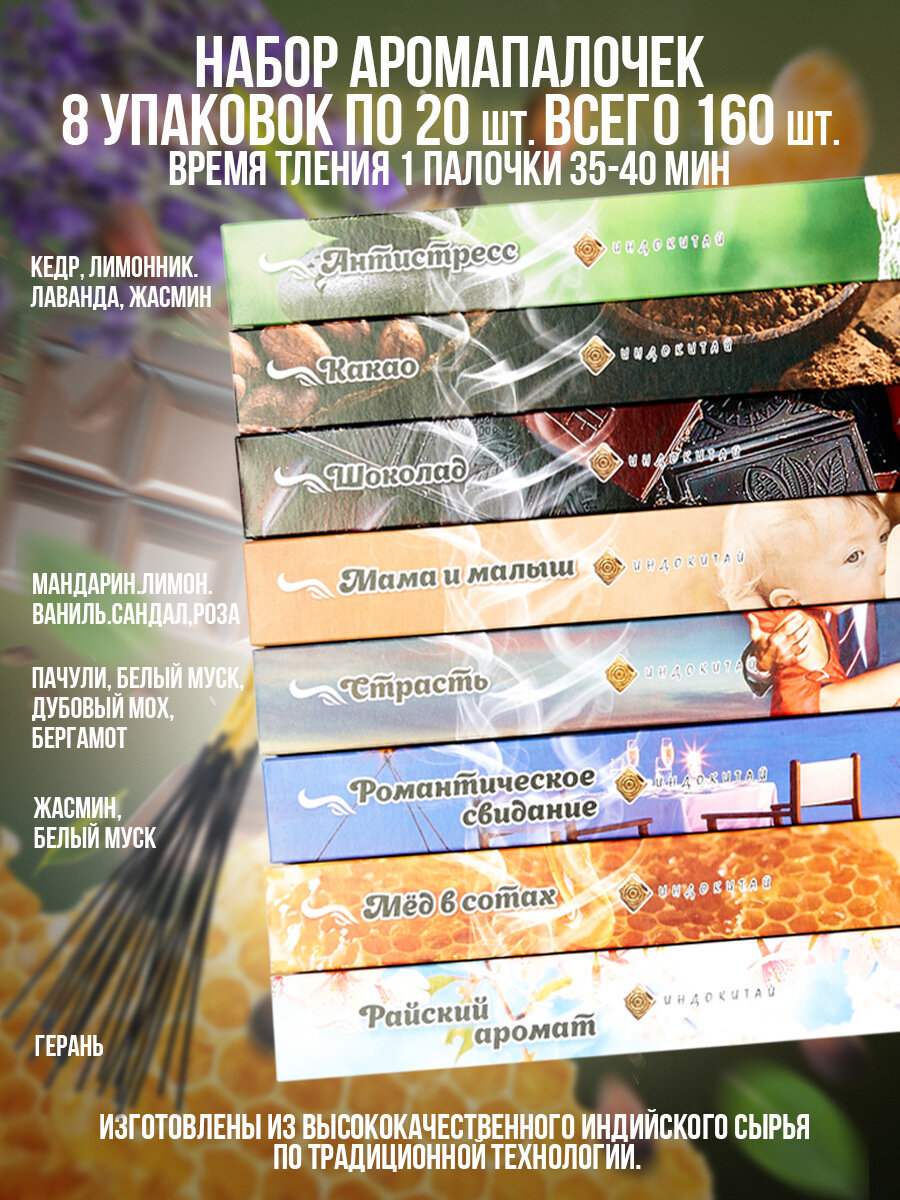 Благовония,Ароматические палочки-"Индокитай"(набор 160шт/8ароматов):Какао,Антистресс,Романтическое свидание,Мед в сотах,Шоколад,Райский аромат.Мама и Малыш,Страсть о