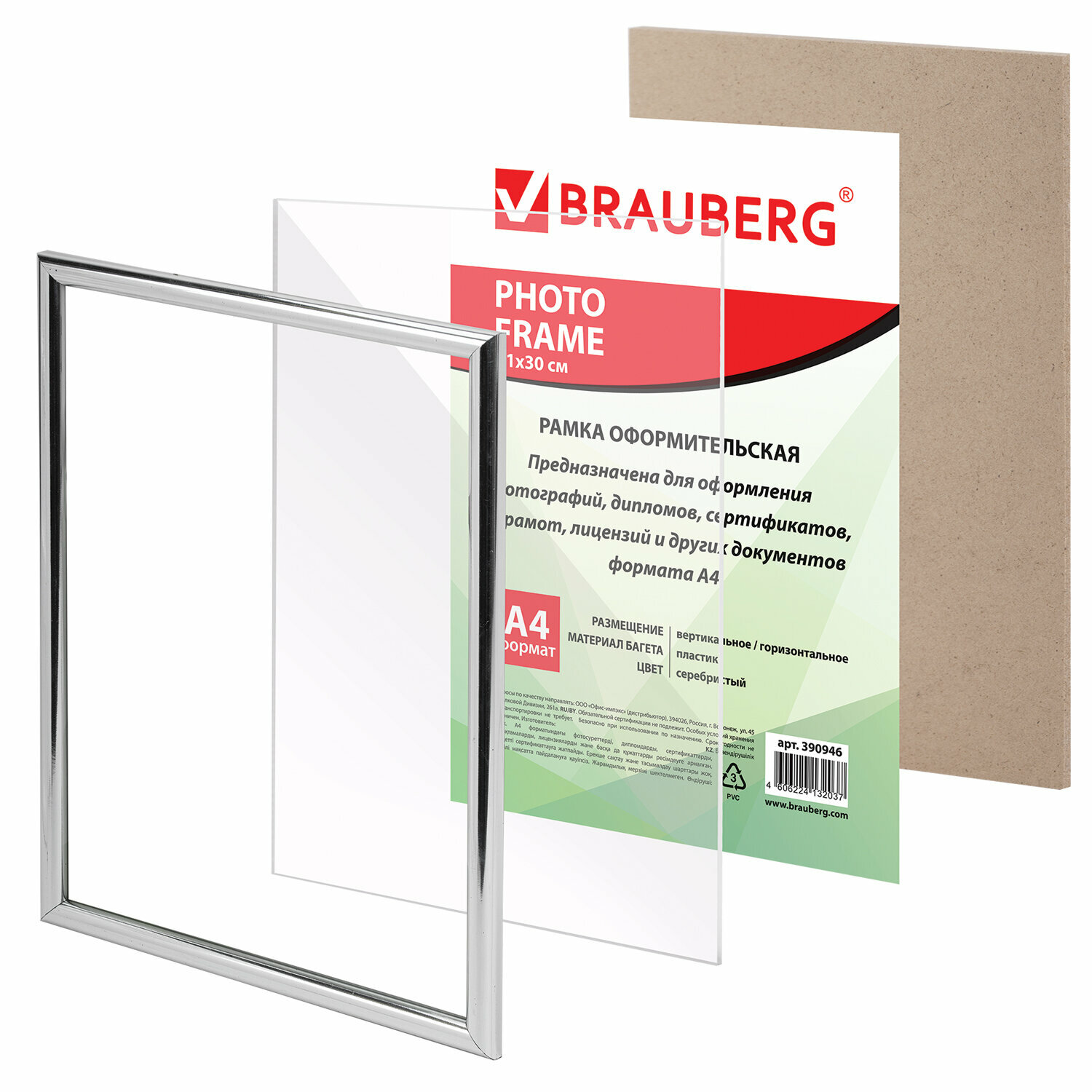 Рамка оформительская Brauberg 21*30 см, пластик, багет 12 мм, HIT2, серебро, стекло (390946)