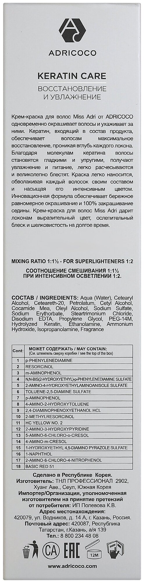 ADRICOCO Miss Adri крем-краска для волос с кератином, 9.44 очень светлый интенсивный медный блонд, 100 мл оригинал