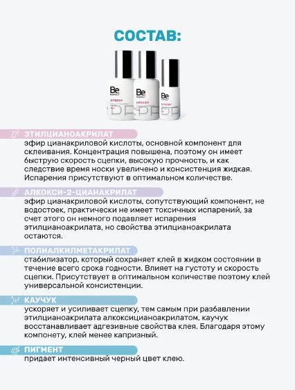 | Состав | Этил-2-цианоакрилат, Метоксиэтилцианоакрилат, Полиметилметакрилат, Краситель |