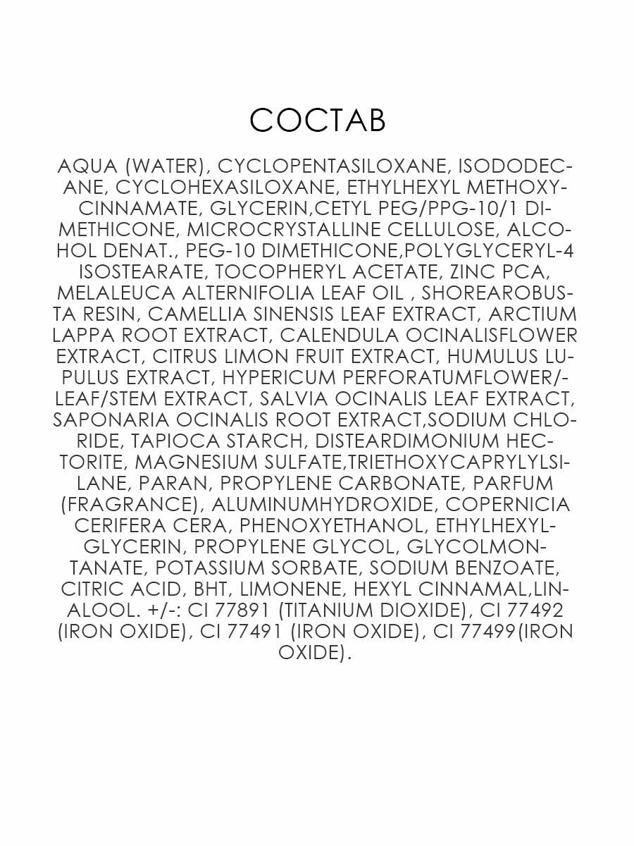 | Состав | aqua (water), cyclopentasiloxane, isododecane, cyclohexasiloxane, ethylhexyl methoxycinnamate, glycerin,cetyl peg/ppg-10/1 dimethicone, microcrystalline cellulose, alcohol denat., peg-10 dimethicone,polyglyceryl-4 isostearate, tocopheryl acetate, zinc pca, melaleuca alternifolia leaf oil , shorearobusta resin, camellia sinensis leaf extract, arctium lappa root extract, calendula ocinalisflower extract, citrus limon fruit extract, humulus lupulus extract, hypericum perforatumflower/leaf/stem extract, salvia ocinalis leaf extract, saponaria ocinalis root extract,sodium chloride, tapioca starch, disteardimonium hectorite, magnesium sulfate,triethoxycaprylylsilane, paran, propylene carbonate, parfum (fragrance), aluminumhydroxide, copernicia cerifera cera, phenoxyethanol, ethylhexylglycerin, propylene glycol, glycolmontanate, potassium sorbate, sodium benzoate, citric acid, bht, limonene, hexyl cinnamal,linalool. +/-: ci 77891 (titanium dioxide), ci 77492 (iron oxide), ci 77491 (iron oxide), ci 77499(iron oxide) |
