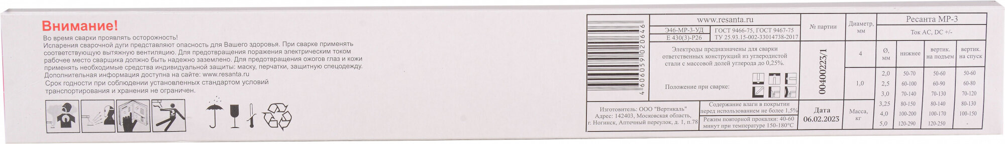 | Дополнительная информация | Электроды РЕСАНТА относятся к высококачественным электродам типа МР-3 с рутиловым покрытием и изготовлены в соответствии с требованиям ГОСТ. |