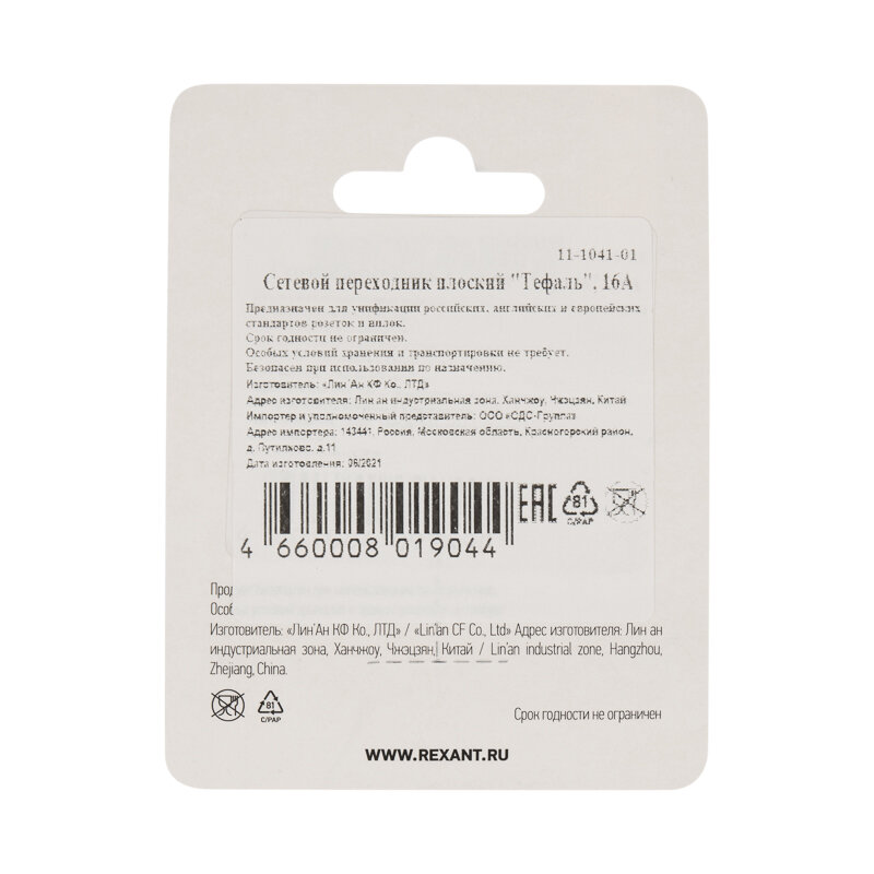 Сетевой переходник плоский "Тефаль" белый REXANT 1шт (блистер F)