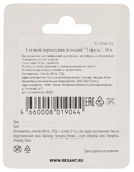 Сетевой переходник плоский «Тефаль» REXANT черный