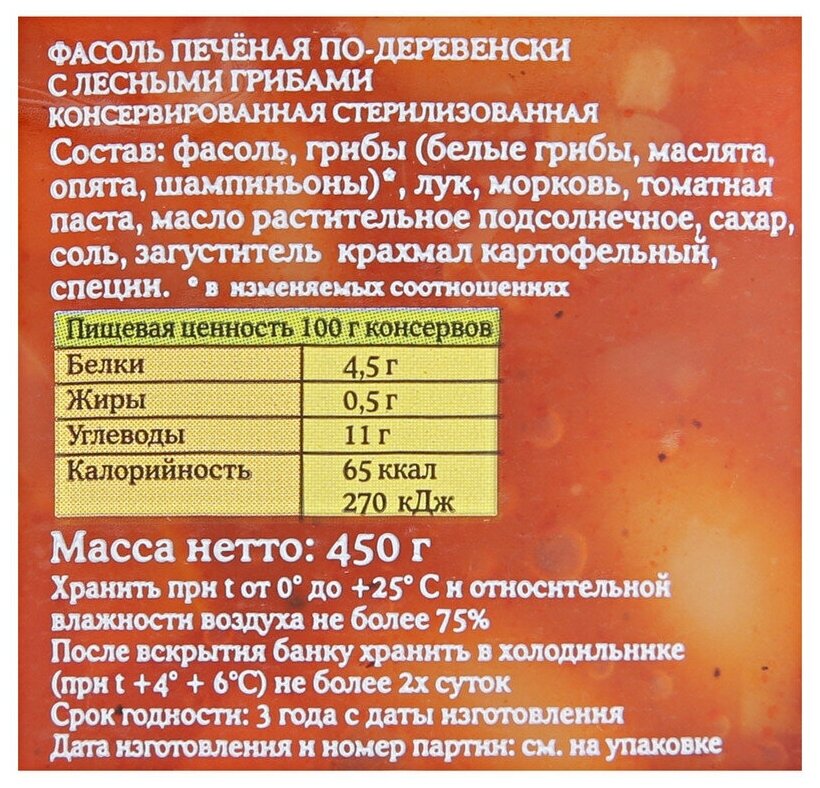 | Состав | фасоль, грибы (белые, лисички, шампиньоны), лук, морковь, томатная паста, масло растительное подсолнечное, сахар, соль, загуститель - картофельный крахмал, перец черный молотый |