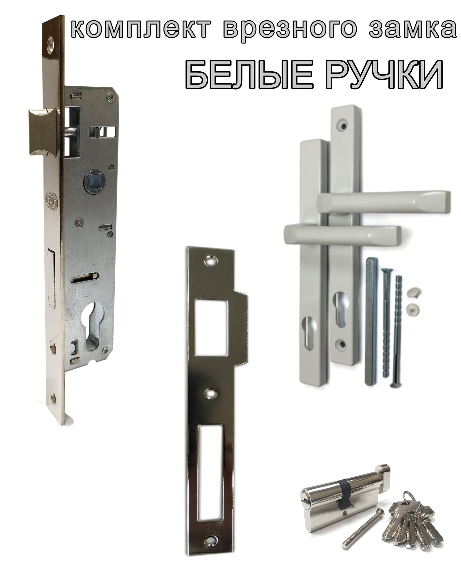 Врезной замок, комплект с ручками и цилиндром (белый) для дверей и калиток интересное: