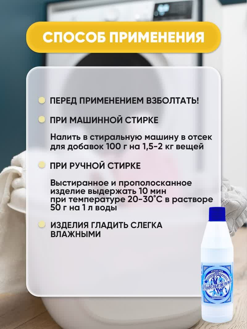 | Способ применения | средство для подкрахмаливания: перд применением взболтать! При машинной стирке. Жидкий крахмал налить в стиральную машину в отсек для добавок 100г крахмала для белья на 1,5-2кг вещей; При ручной стирке. Оставить стираное вручную изделие на 10 минут при температуре 20-30 градусов в растворе (подкрахмаливающее средство для стирки 50 г на 1 л воды). |