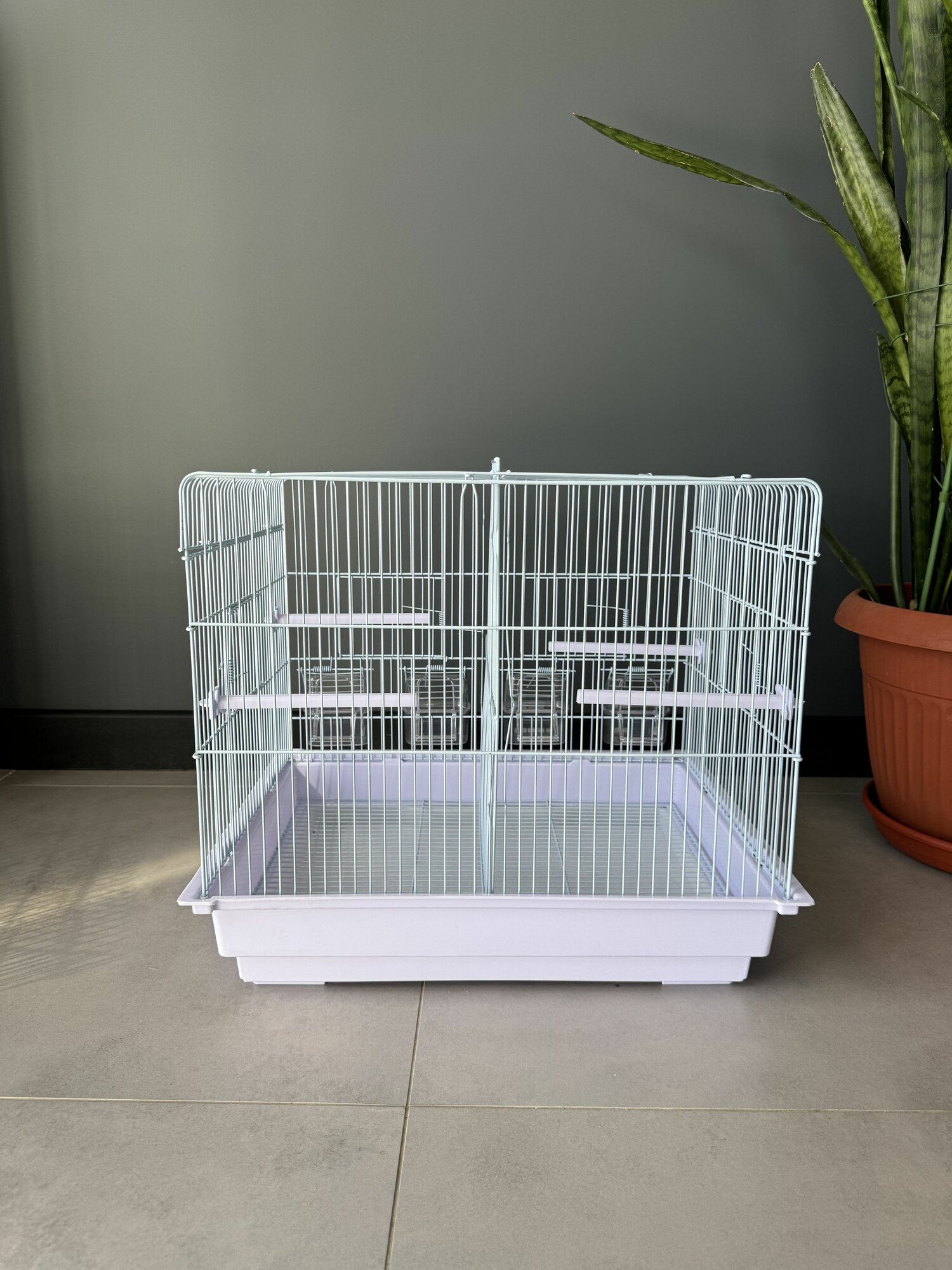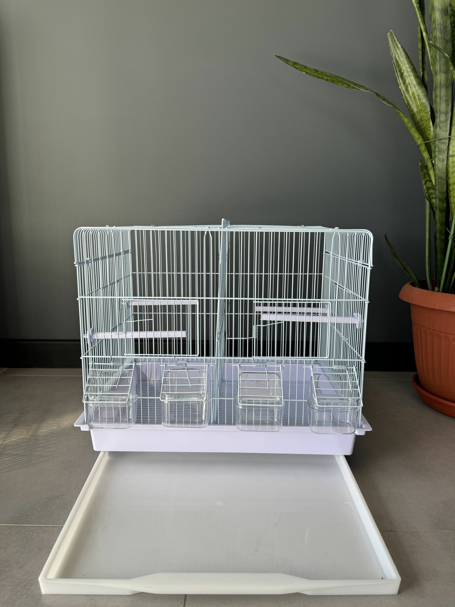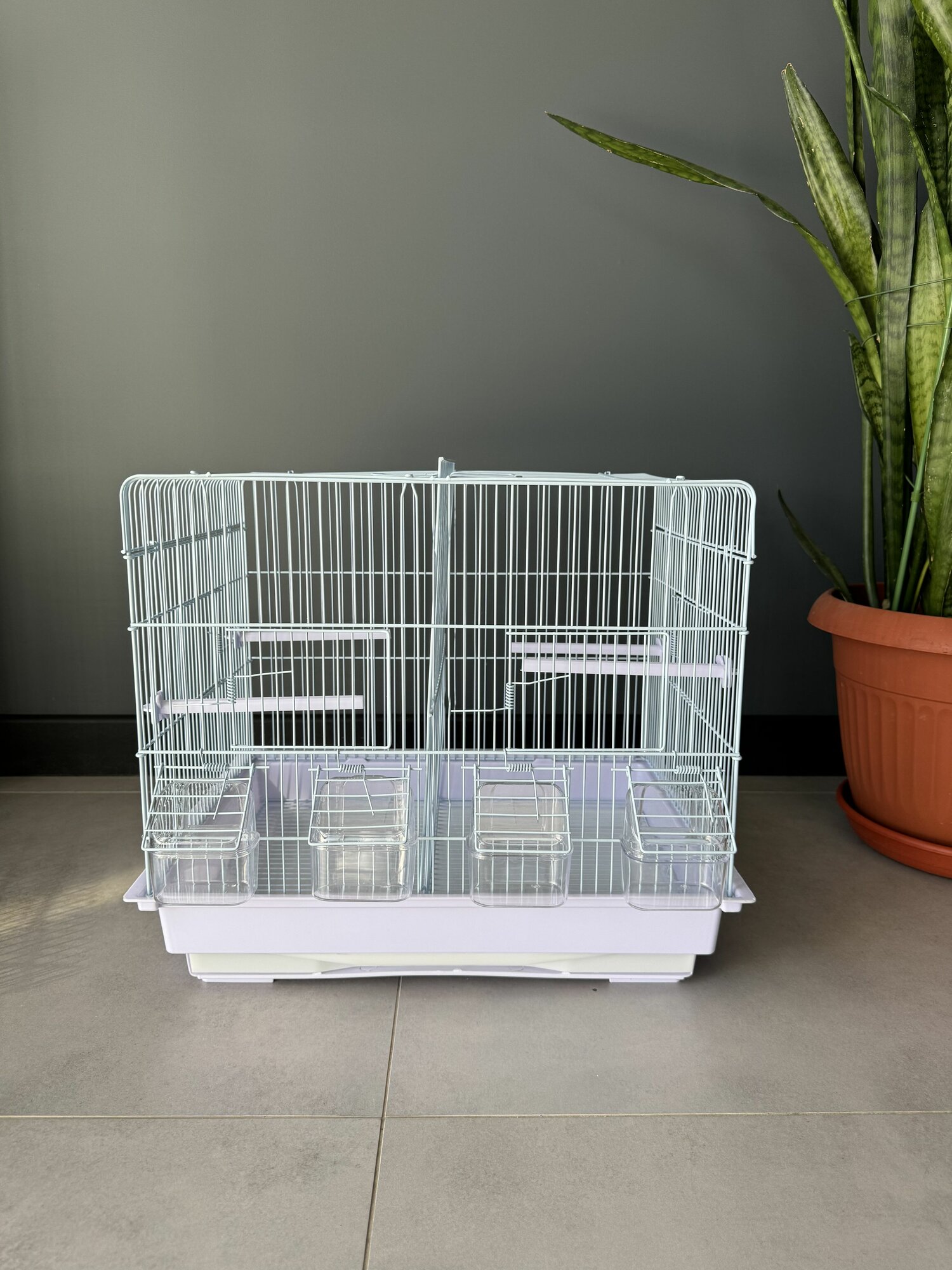 Купить Клетка для птиц, 48х37х41 см., разделение на секции, выдвижной поддон, фальшдно, поилки-кормушки, жердочки, белый