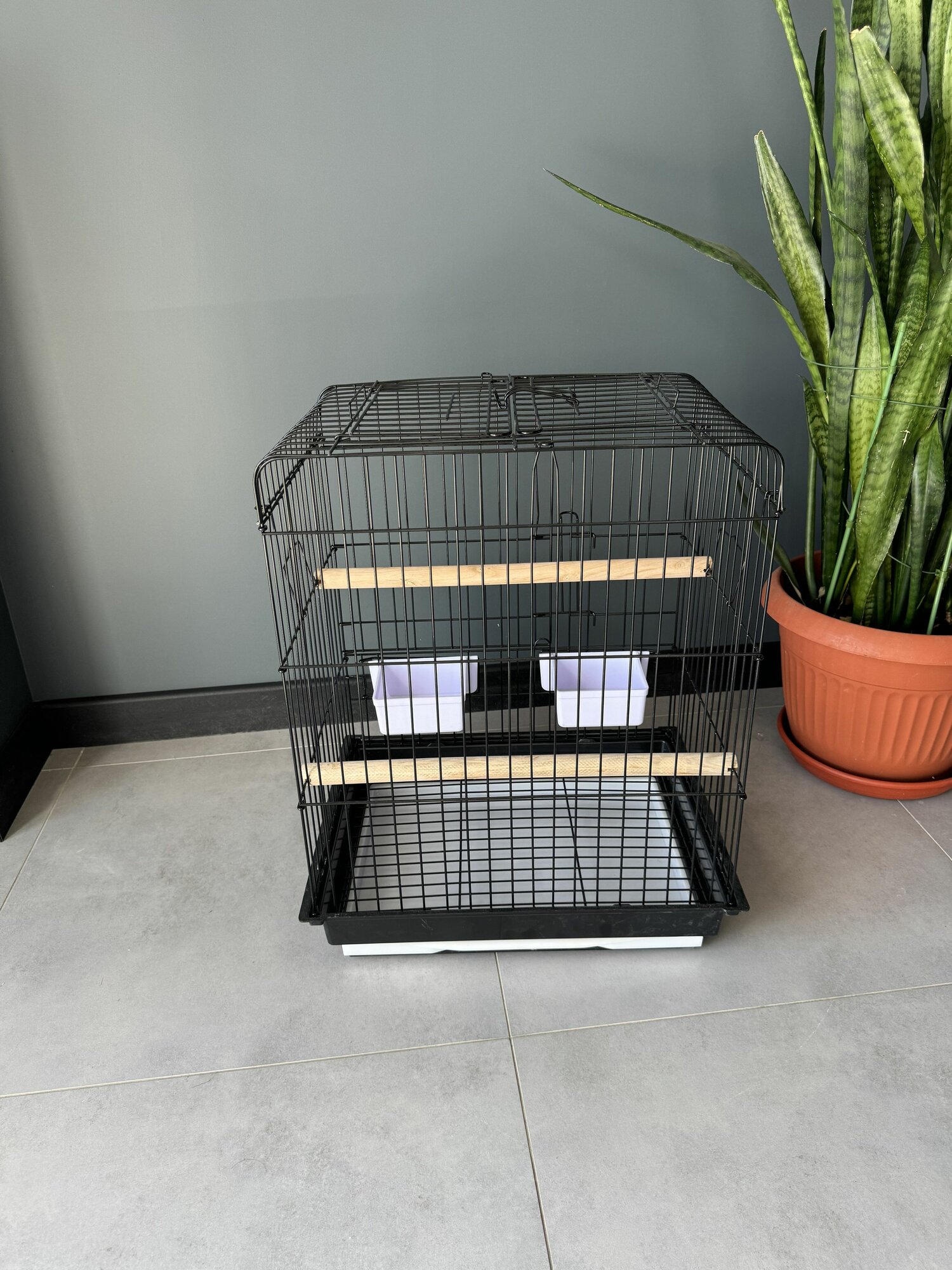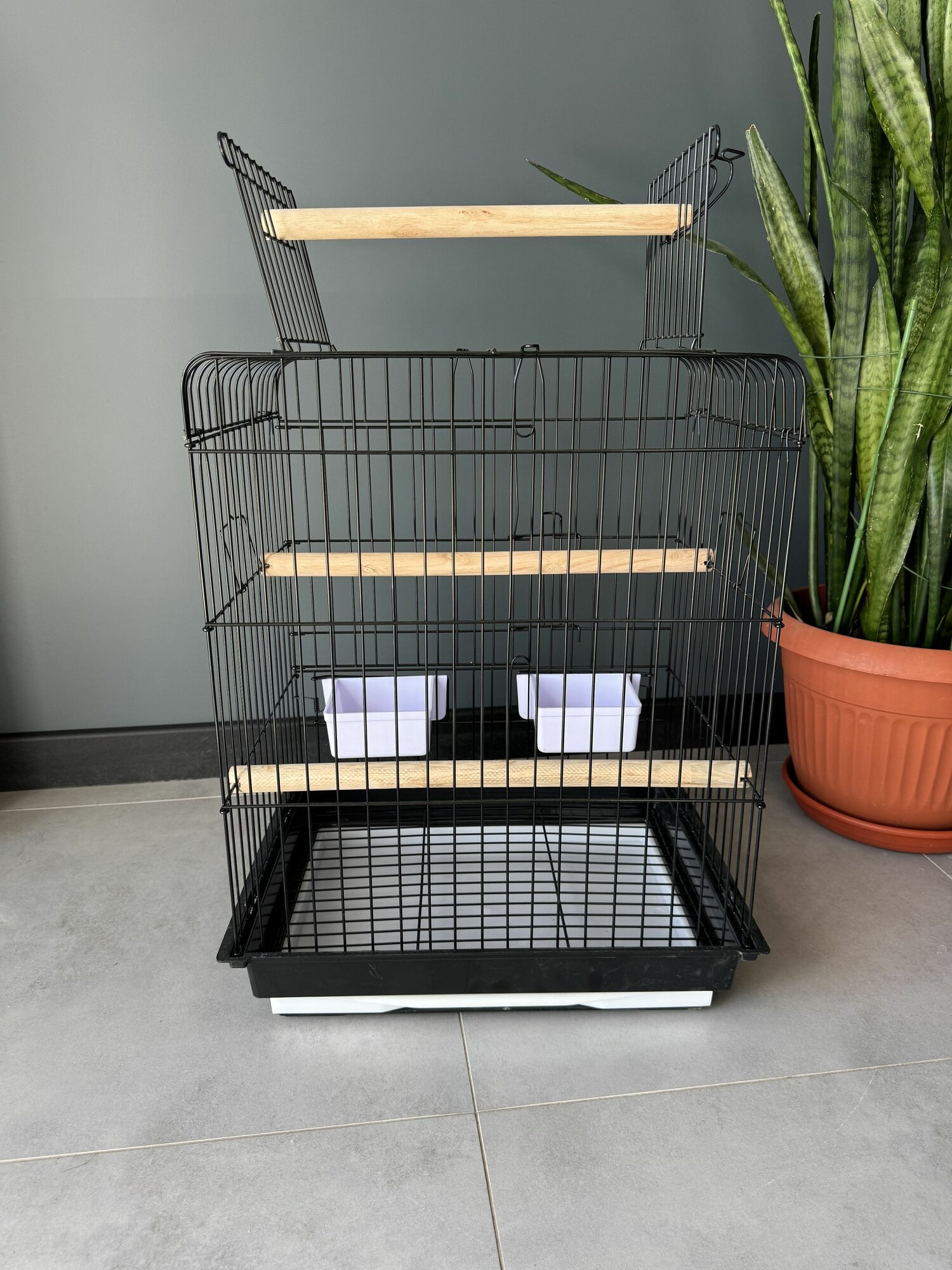 Клетка для птиц, 48х37х41 см., разделение на секции, выдвижной поддон, фальшдно, поилки-кормушки, жердочки, черный