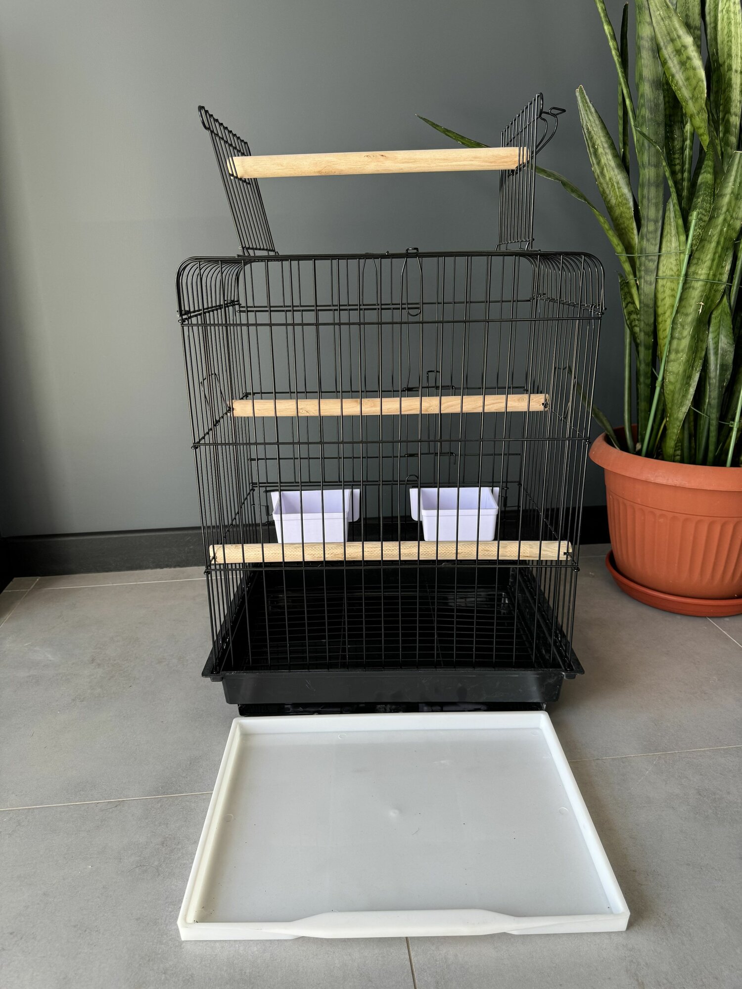 Клетка для птиц, 47х47х86 см., открывающийся верх, выдвижной поддон, фальшдно, поилки-кормушки, деревянные жердочки, белый