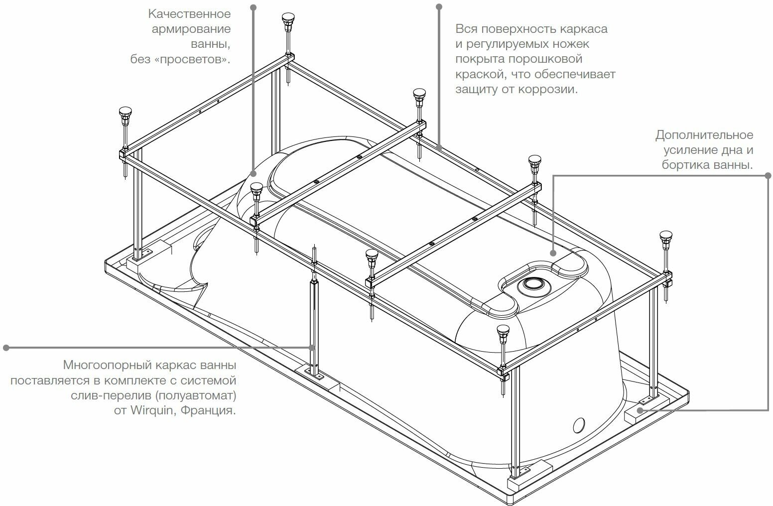 | Комплектация | Монтажный комплект (хромированные ручки, каркас, комплект креплений к стене, система слив-перелив) |