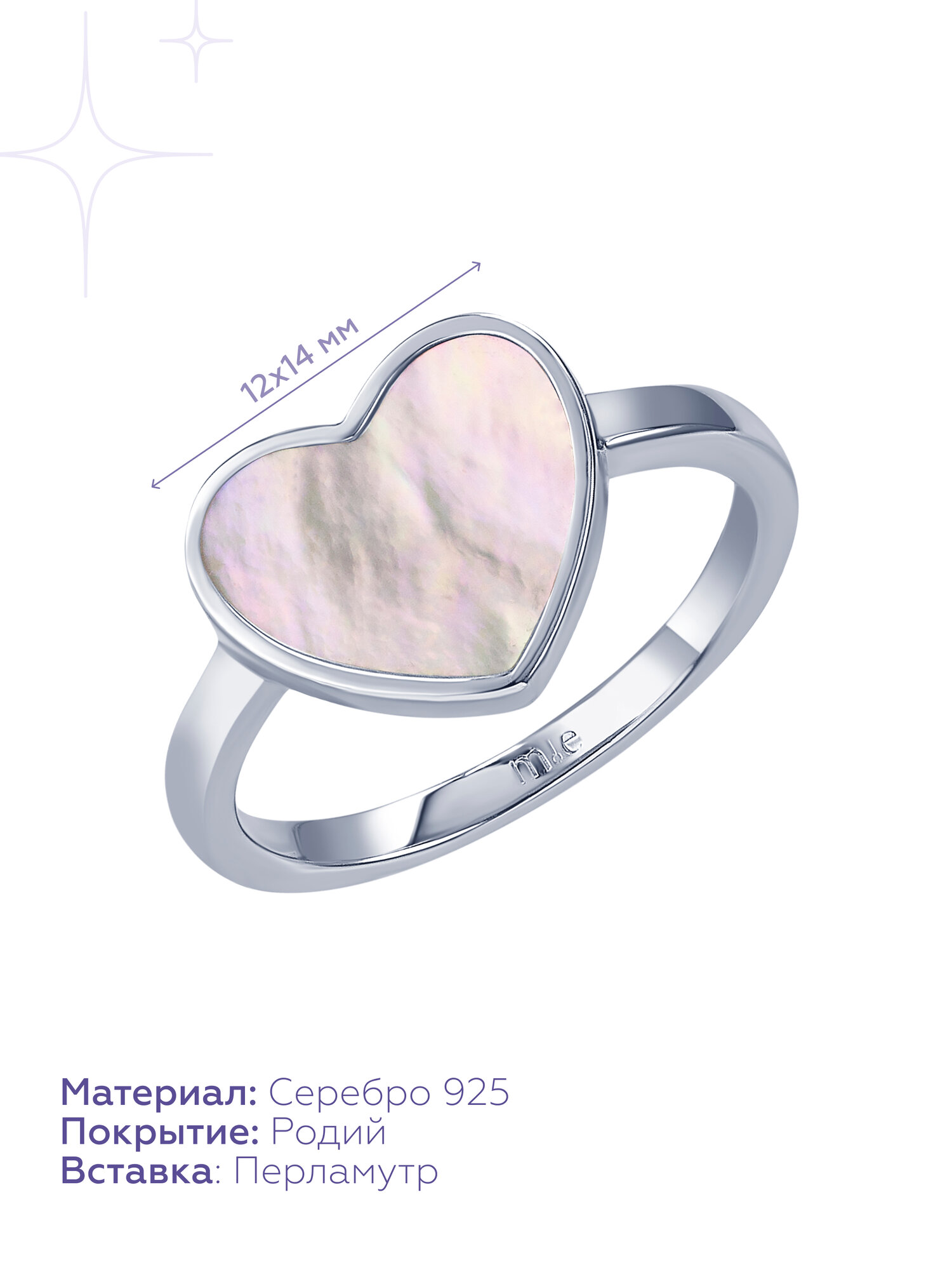 Кольцо ювелирное MIESTILO серебро 925 женское, сердечко с перламутром, 19 размер