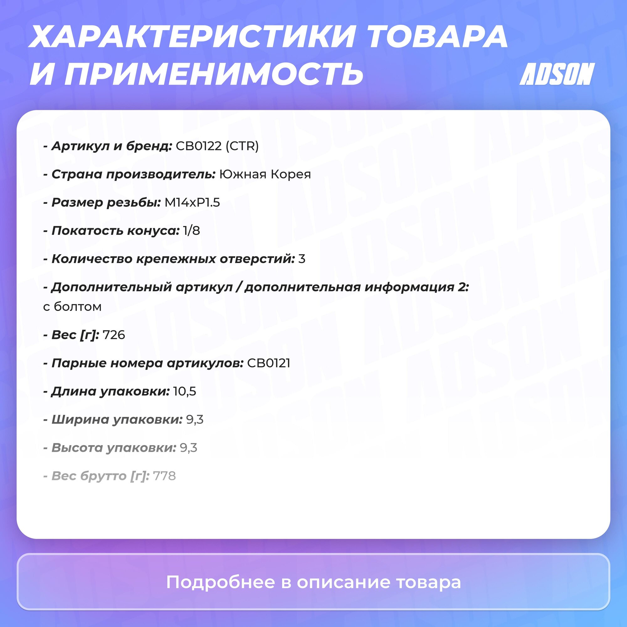Ниже Вы можете прочитать отзывы на CTR CB0122 / CBHO-38 Опора шаровая | перед лев |, ознакомится с подробными характеристиками, посмотреть интересные обзоры и фотографии на CTR CB0122 / CBHO-38 Опора шаровая | перед лев |.