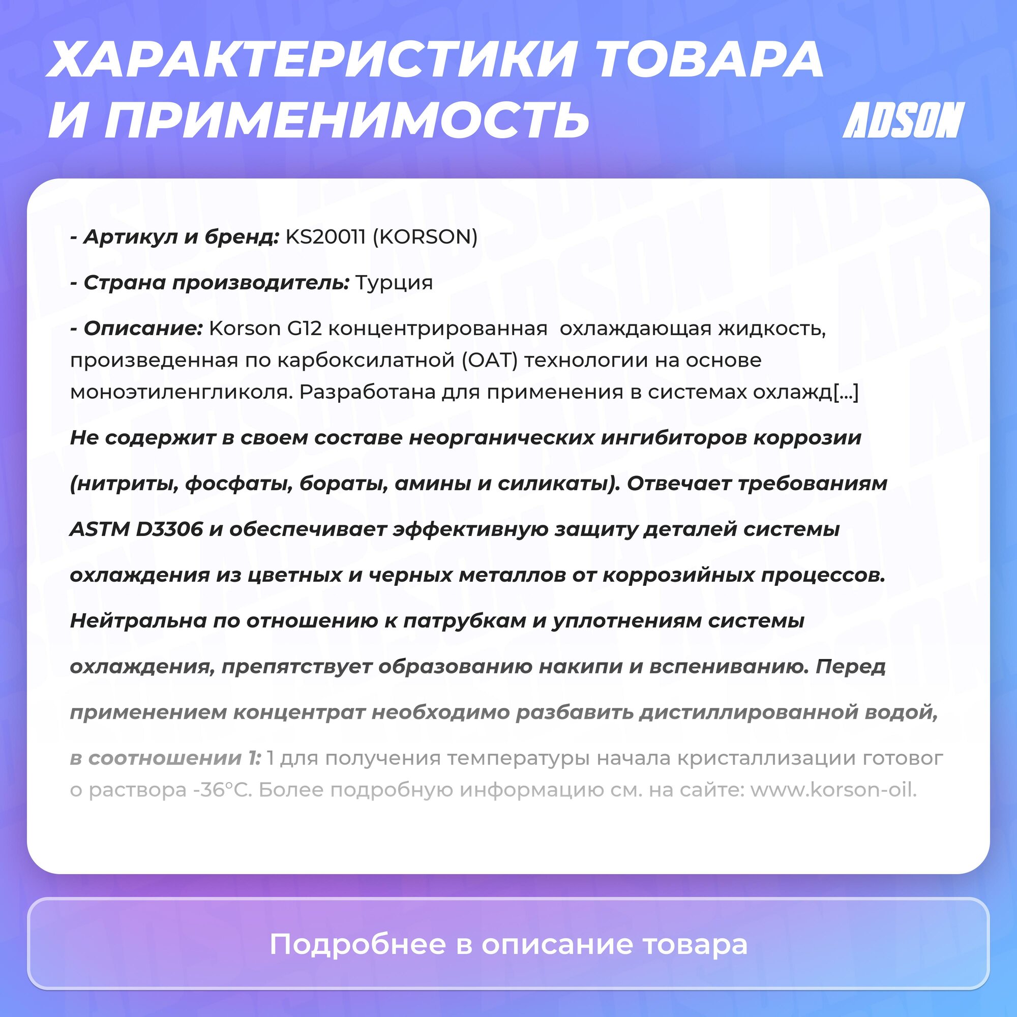 Антифриз готовый раствор G12 -36 зеленый 1л KORSON KS20061 интересное: