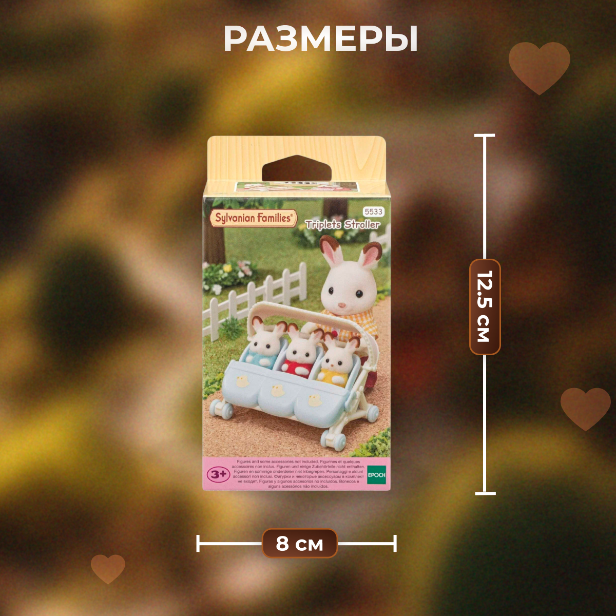 | Дополнительная информация | «Автокемпер» и «Семейный автомобиль, красный» (приобретается отдельно); в коляску помещаются сразу все 3 малыша из Sylvanian Familie |
