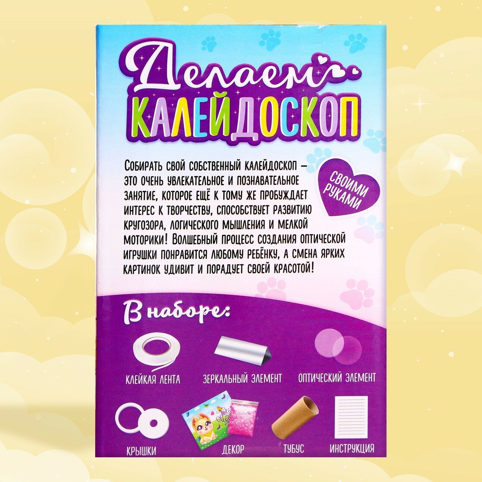| Дополнительная информация | Сделайте настоящий калейдоскоп вместе со Школой талантов. Для этого в наборе есть всё необходимое: тубус-основа, наклейка для декора, зеркало-треугольник, оптический элемент, крышки-заглушки, блёстки. Внимательно следуйте инструкции, и у вас получится милый калейдоскоп, который станет увлекательной игрушкой для любого ребёнка. |
