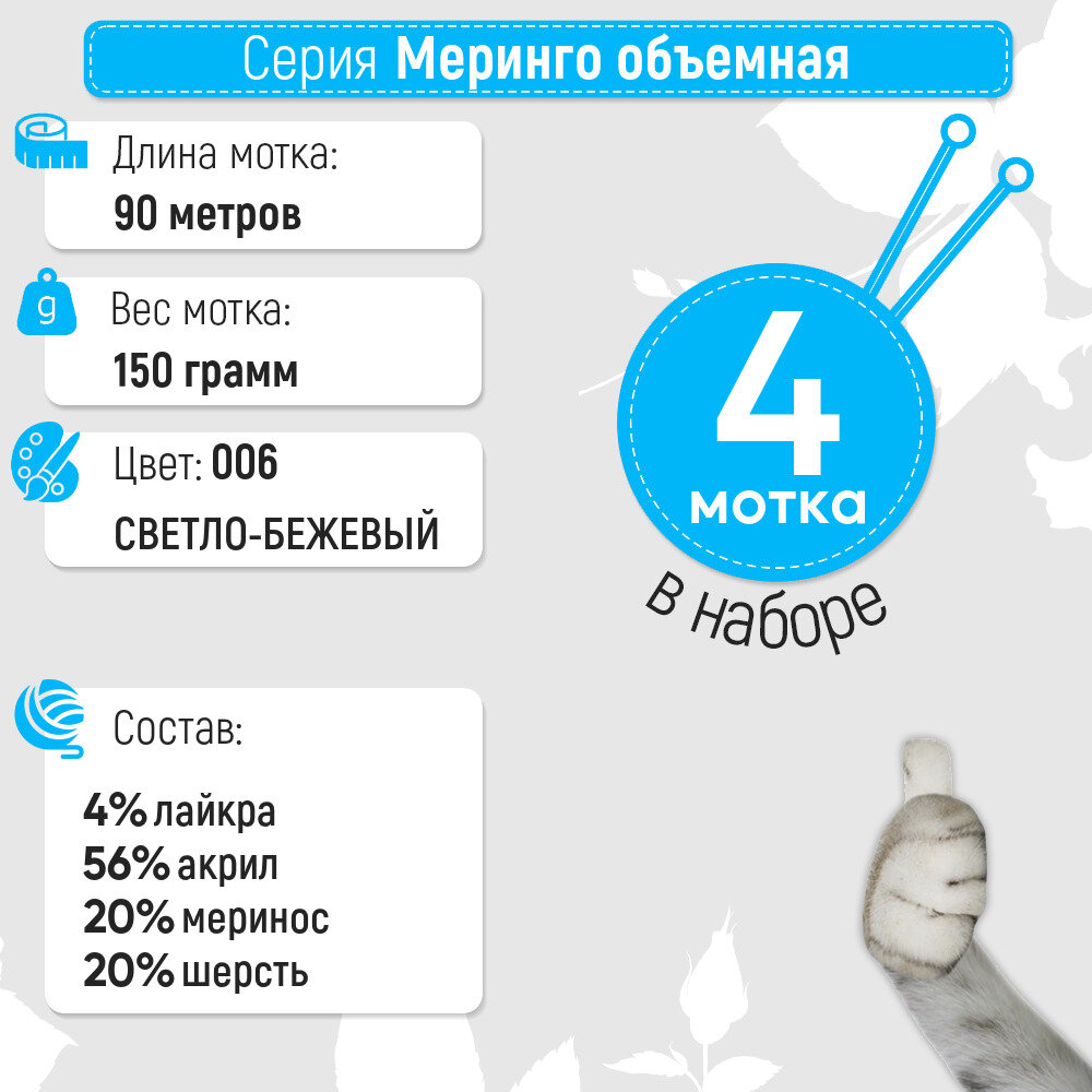 Купить Пряжа для вязания Камтекс 'Меринго объемная', 150г, 90м (20% меринос, 20% полутонкая шерсть, 56% акрил, 4% лайкра) (006 светло-бежевый), 4 мотка
