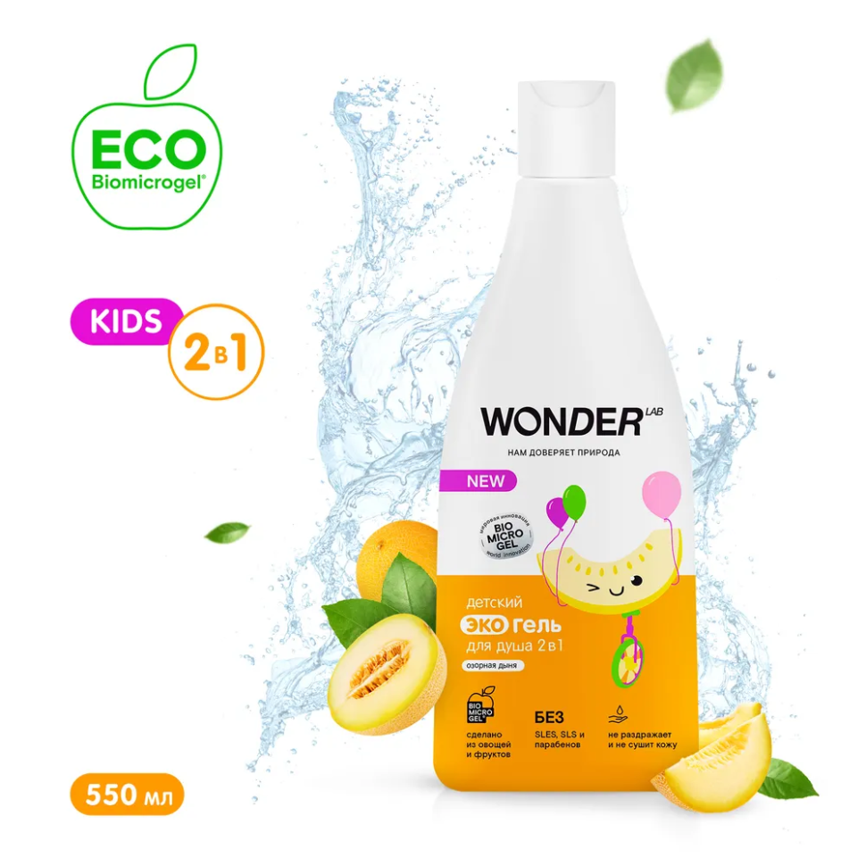 Детский эко гель 2в1 для купания детей WONDER LAB, с ароматом "Озорная дыня", гель - шампунь для душа, 3+, 550 мл