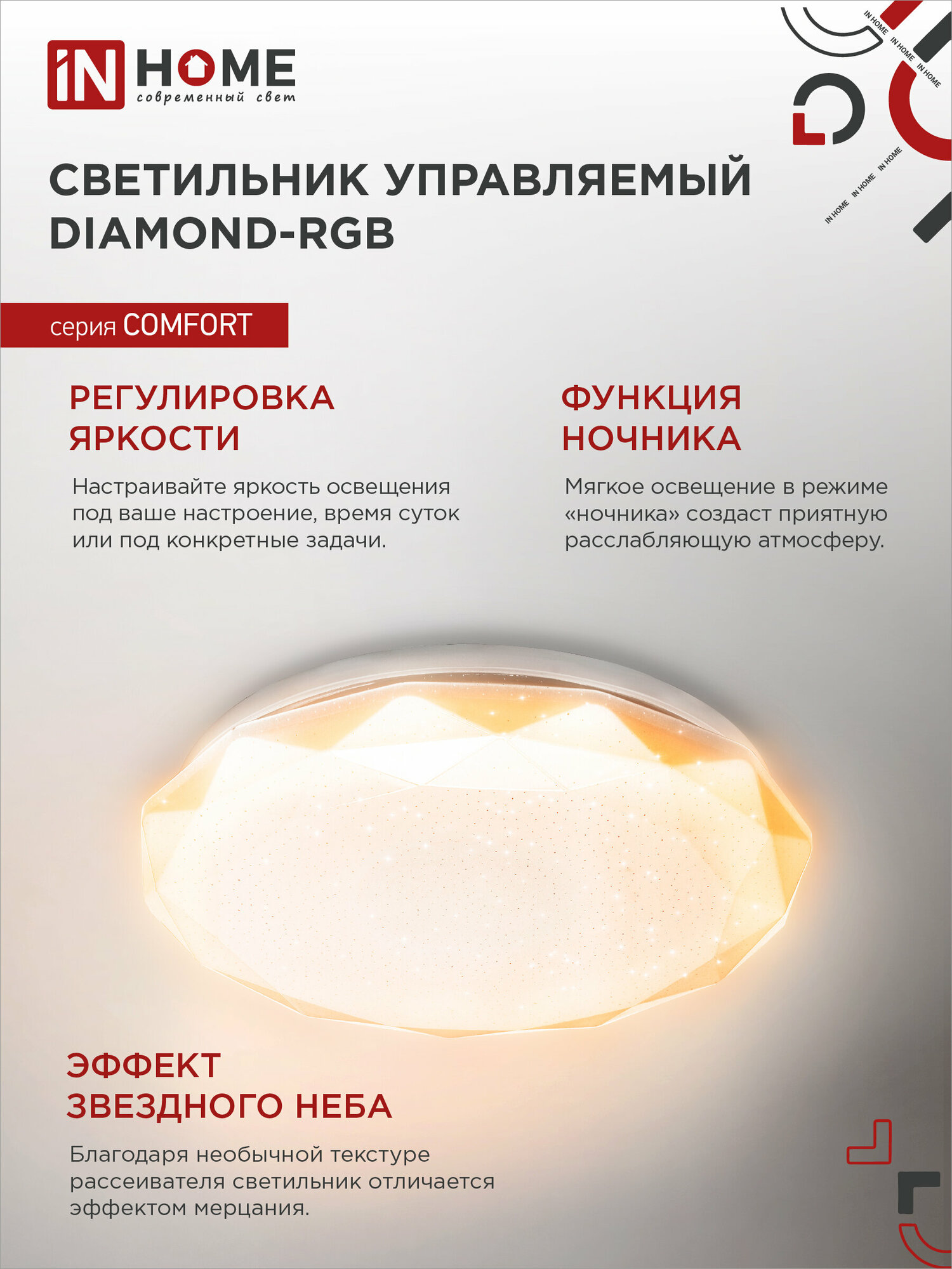 Светильник светодиодный COMFORT DIAMOND, RGB подсветка, 75Вт 230В 3000-6500К 6000лм, пульт ДУ, IN HOME