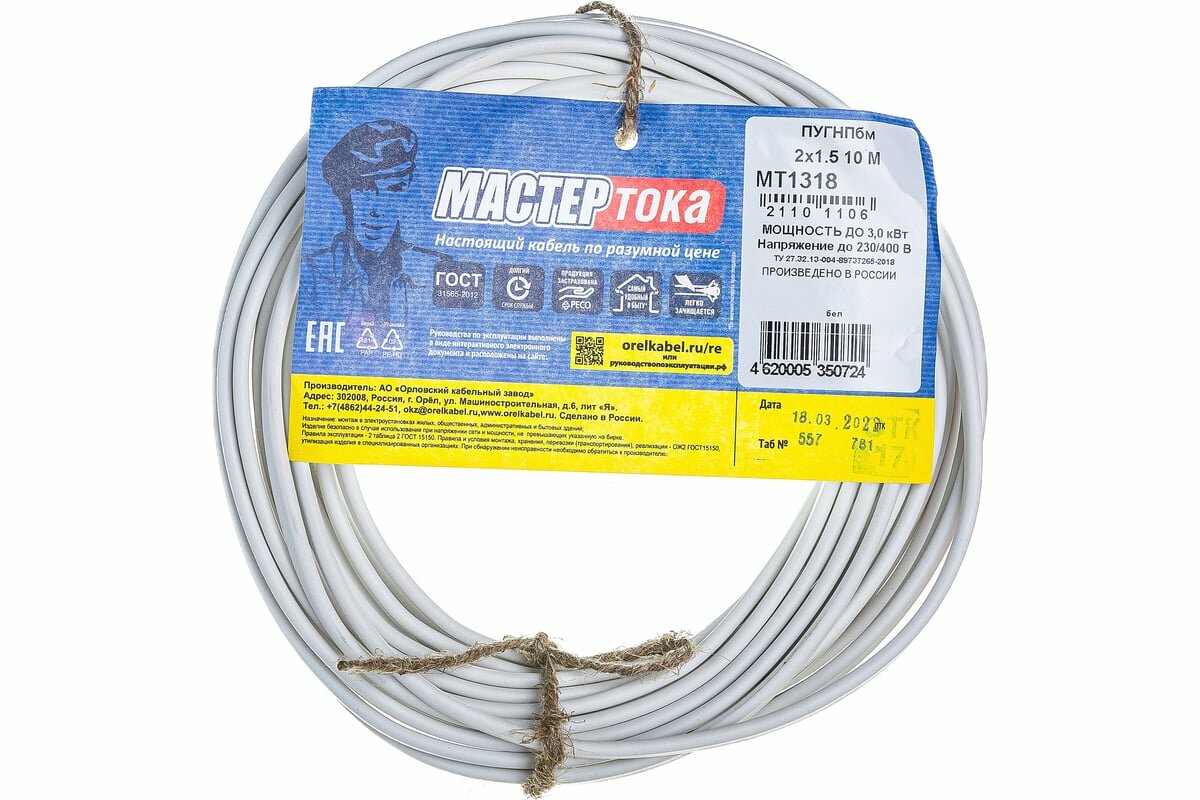 Провод пугнпбм 2Х1.5 бел 20м Мастер Тока ТУ
