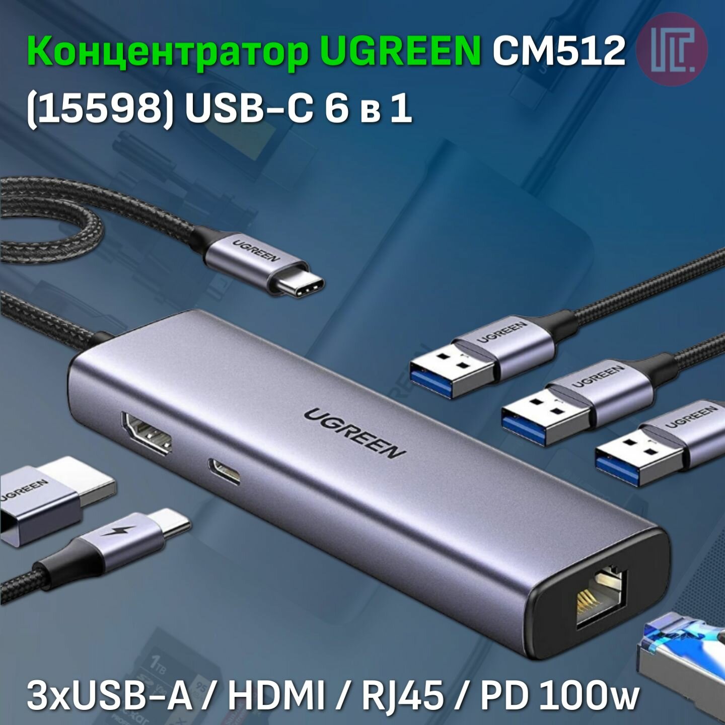 Хаб 6 в 1 Ugreen USB-C CM512, HDMI 4K 30Гц, 3xUSB-A 3.0, LAN RJ45 (1Gbit), PD зарядка 100Вт, серый космос (15598)