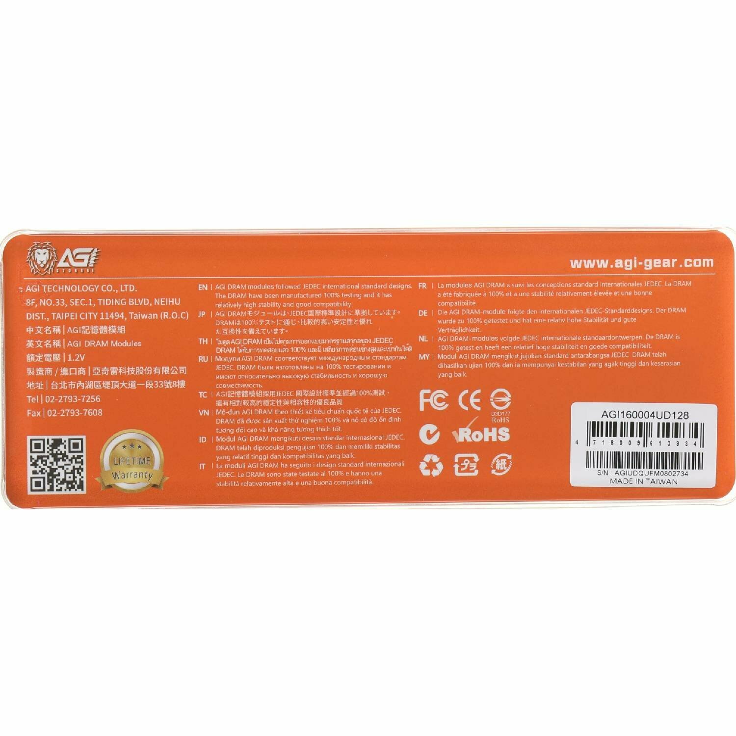 Оперативная память AGI UD128 AGI160004UD128 DDR3 - 1x 4ГБ 1600МГц, DIMM, Ret