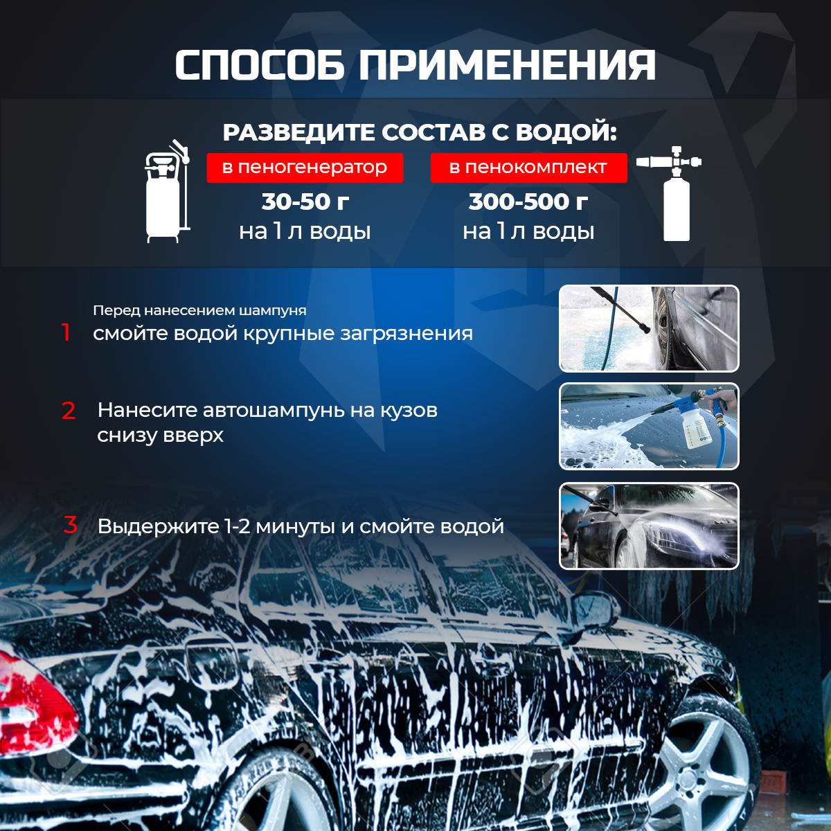 | Способ применения | 1. Перед нанесением средство необходимо разбавить с водой из расчета 1:1-1:2 (300-500 г) в пенокомплект (1л) или 1:20-1:30 (30-50 г/л) для пеногенератора (25,50,100 л), в зависимости от степени загрязнения. 2. Остудить кузов автомобиля. При необходимости сбить верхний слой грязи, после чего нанести разбавленный состав снизу вверх, чтобы избежать подтеков. 3. Выдержать 1-2 мин. не допуская высыхания! 4. Тщательно смыть водой под высоким давлением с близкого расстояния (15-20 см) снизу вверх. |