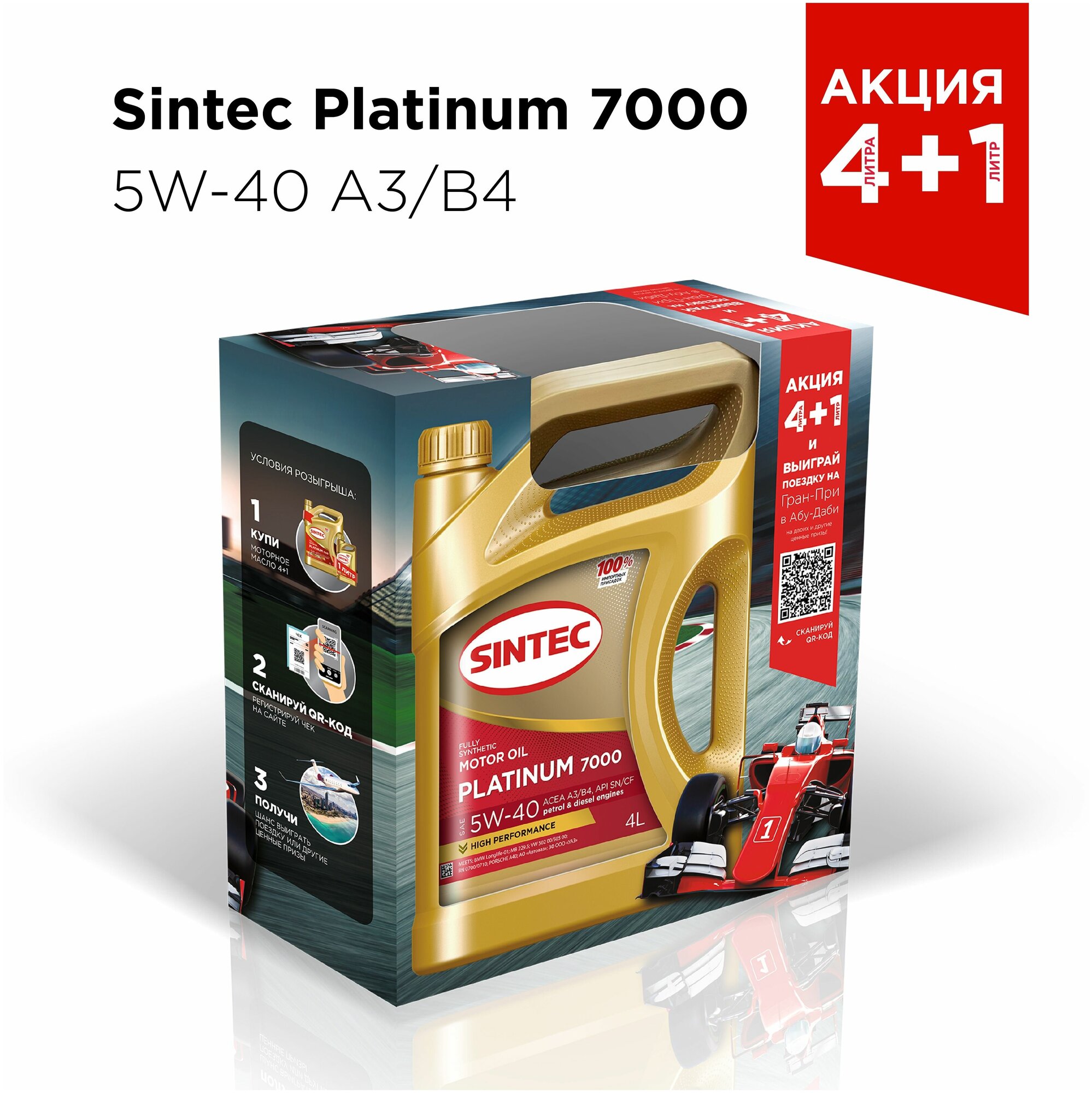 Акция! 4 Л + 1 Л В подарок Моторное масло SINTEC PLATINUM 7000 SAE 5W-40, API SN/CF, ACEA A3/B4 Синтетическое 5 л интересное: