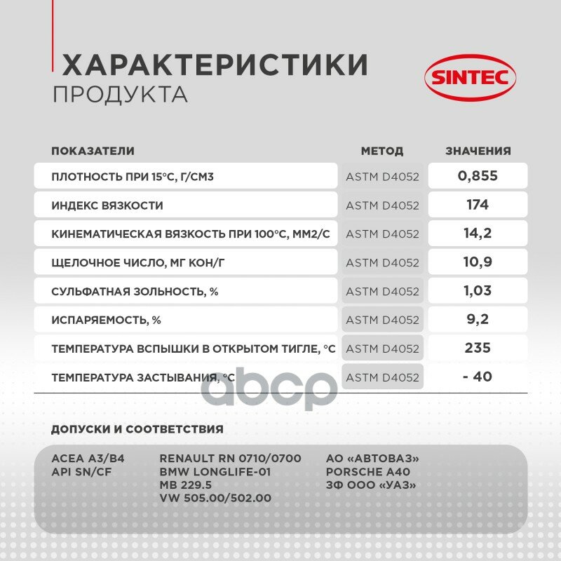 | Дополнительная информация | BMW Longlife-01; MB 229.5; Porsche A40; Renault RN 0700/0710; VW 502.00/505.00; ЗФ ООО «УАЗ»; АО «АВТОВАЗ» |