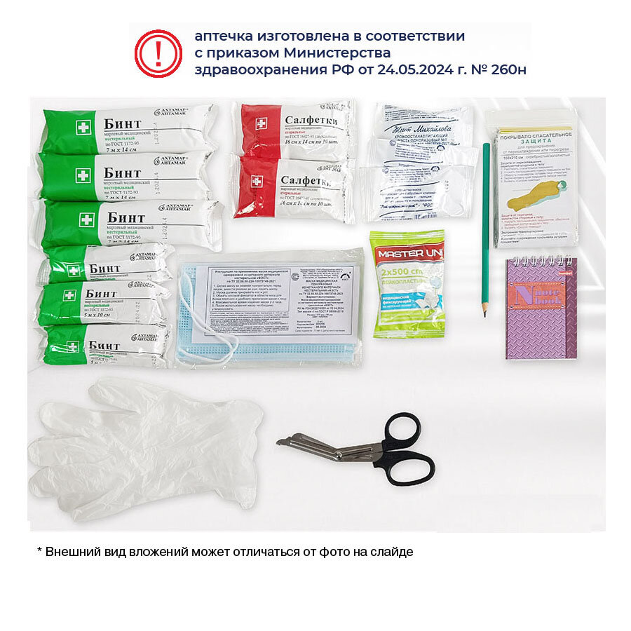 | Дополнительная информация | Аптечка автомобильная ГОСТ 2024/для техосмотра /новый состав/Нового образца |