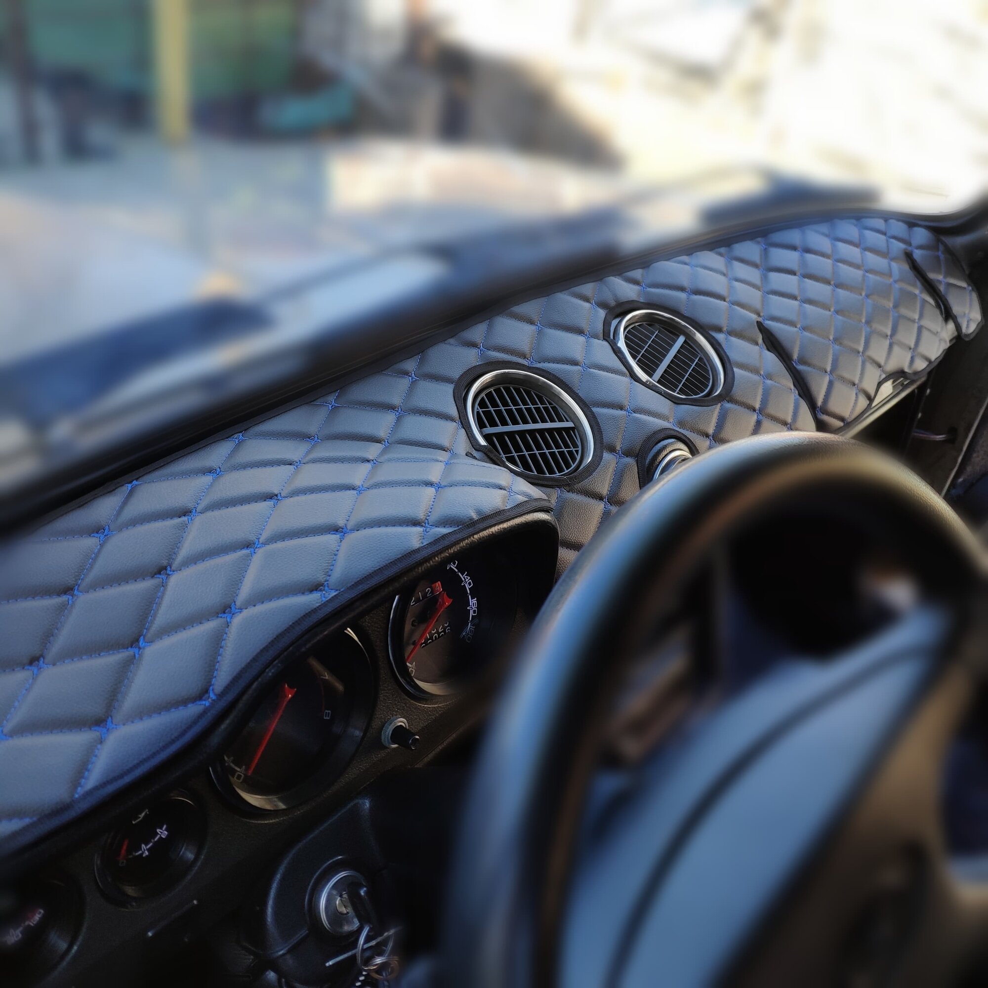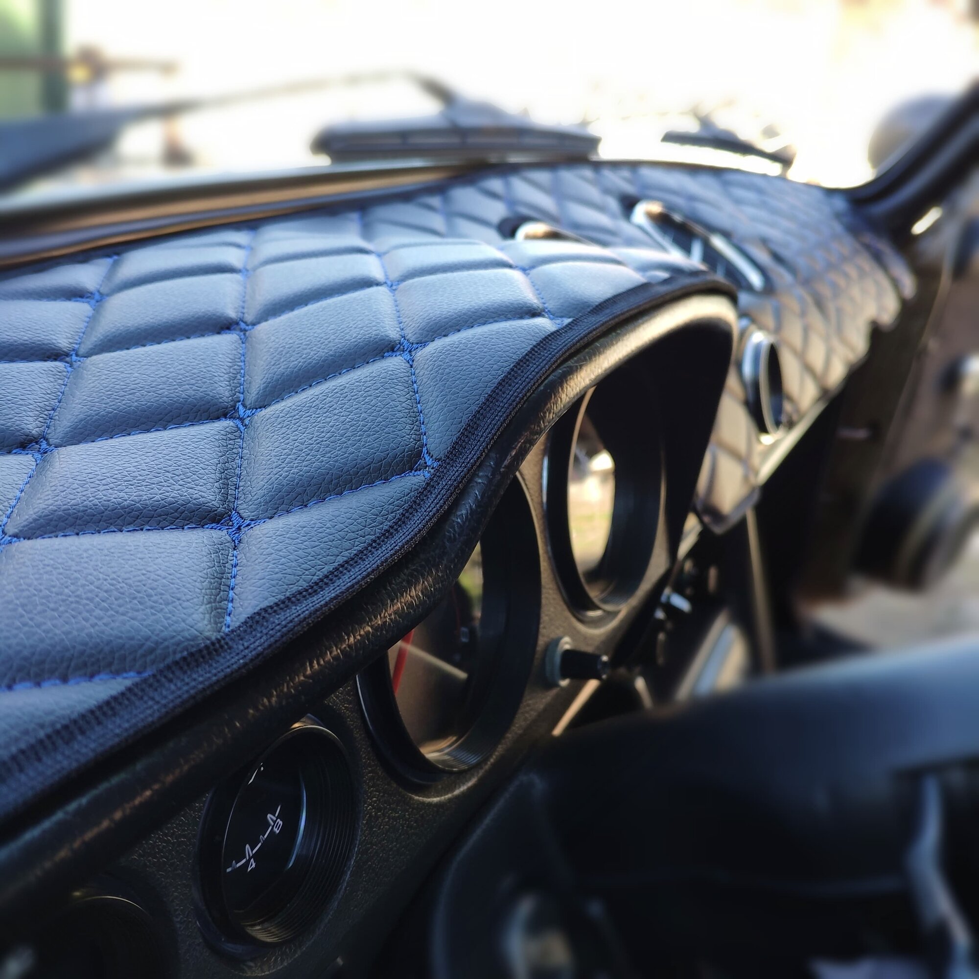 Накидка на панель ВАЗ 2106 из стеганной экокожи (черная с синей строчкой)