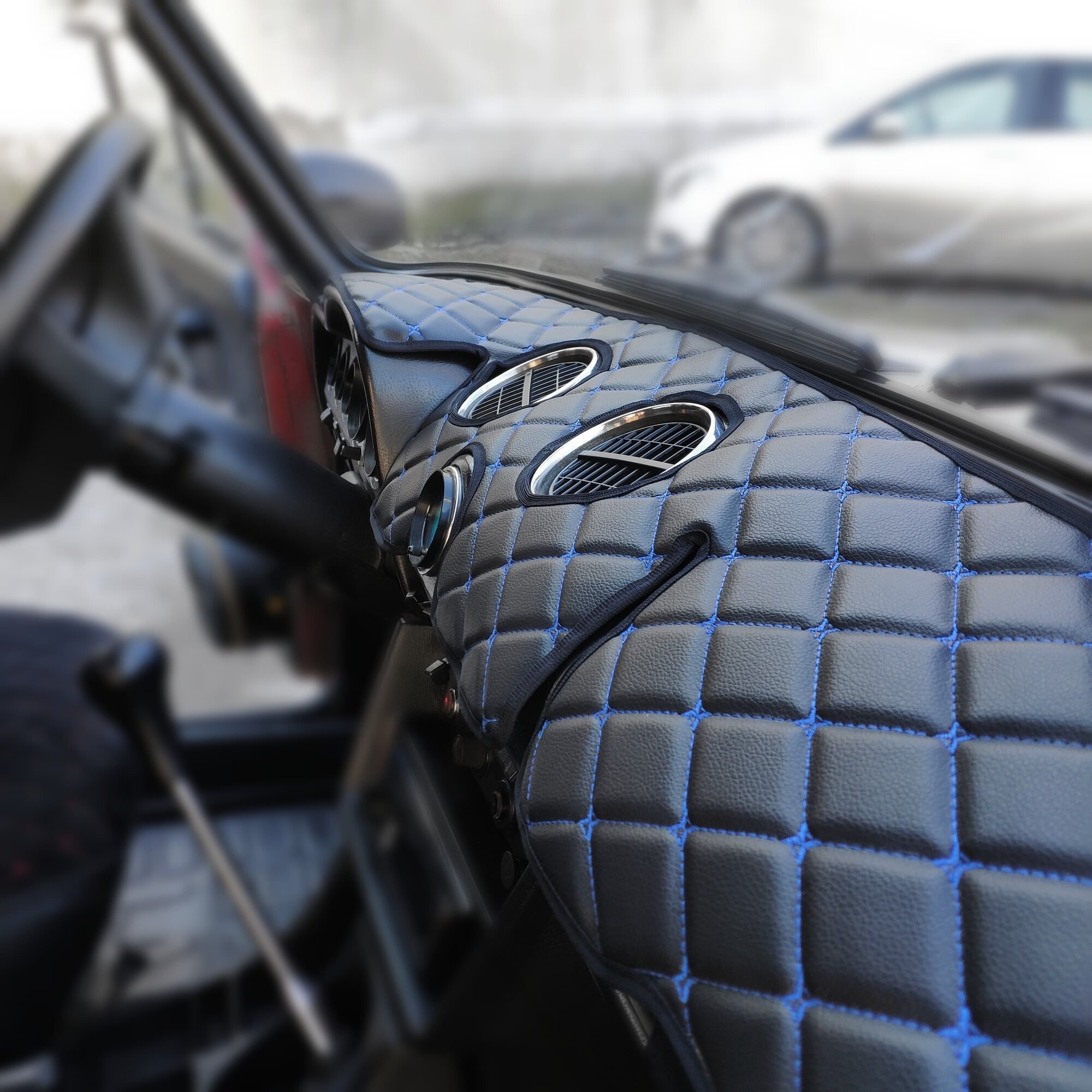 Накидка на панель ВАЗ 2106 из стеганной экокожи черной с синей прострочкой интересное: