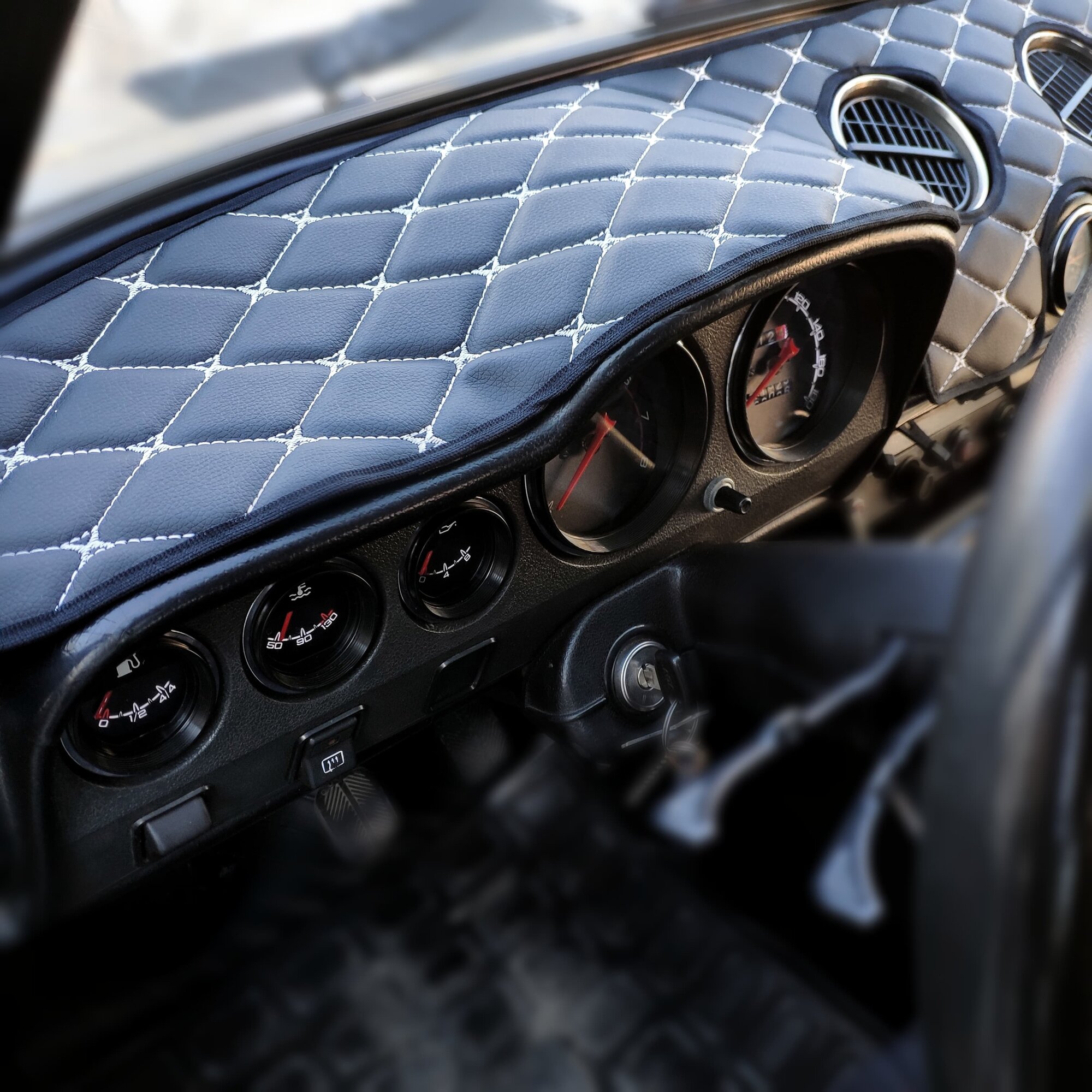 Накидка на панель ВАЗ 2106 из стеганной экокожи (черная с синей строчкой)