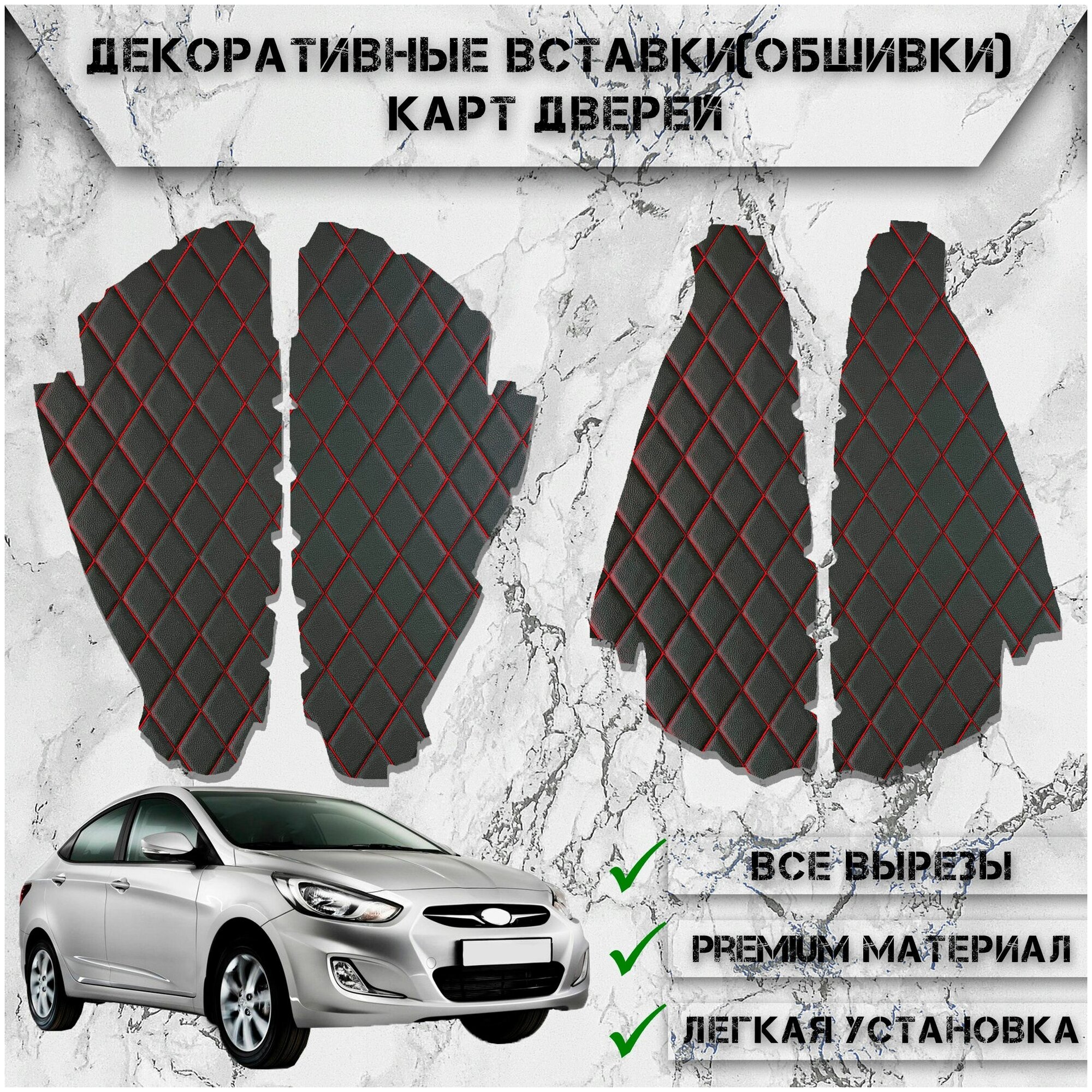 Декоративные вставки обшивки карт дверей из Экокожи для Hyundai Solaris / Хендай Солярис (2011-2017) Чёрные с Красной строчкой интересное: