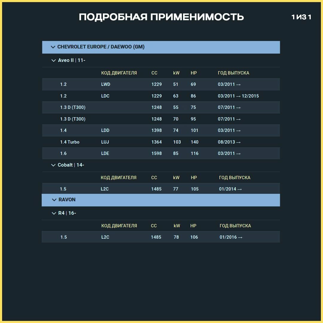 | Модель автомобиля | Chevrolet Aveo / Chevrolet Cobalt / Ravon R4 |