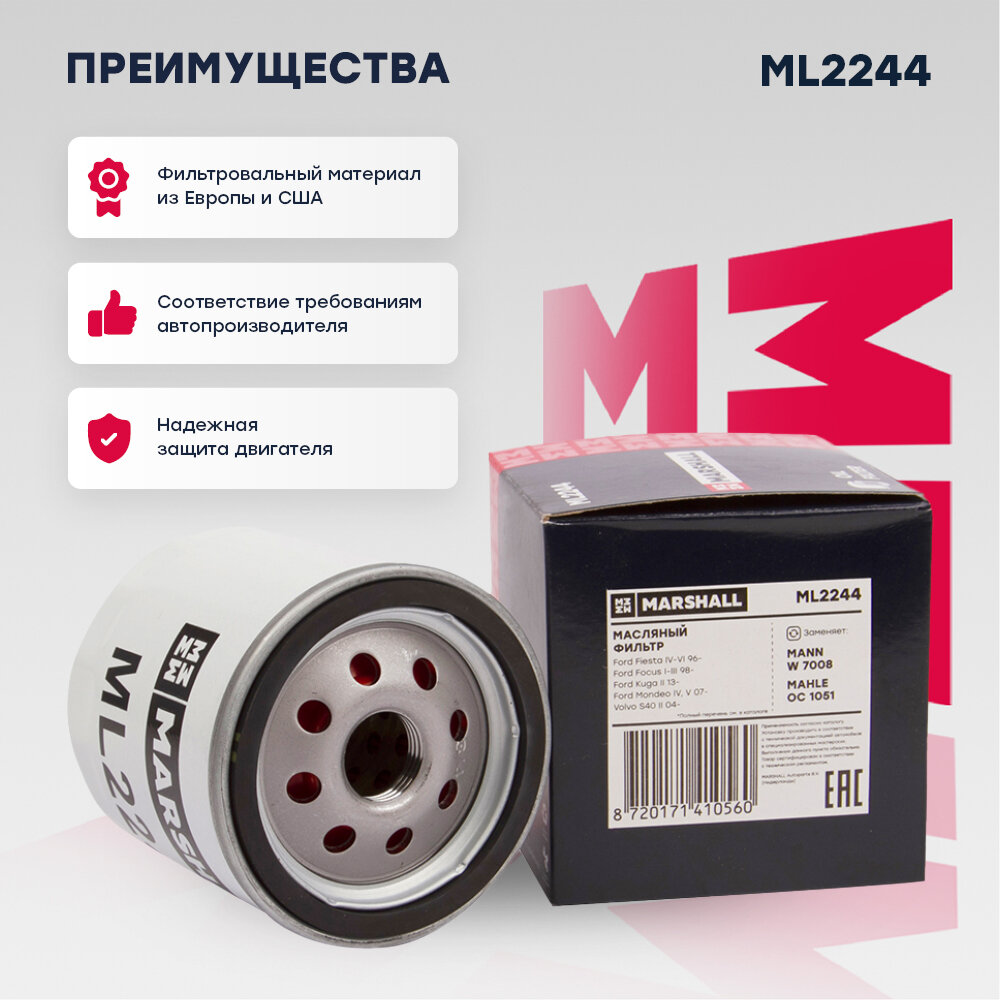 Фильтр масляный MARSHALL ML2244 для Ford Fiesta 96-, Ford Focus 98-, Ford Kuga 13-, Ford Mondeo 07-, Volvo S4004- // кросс-номер MANN W 7008 интересное: