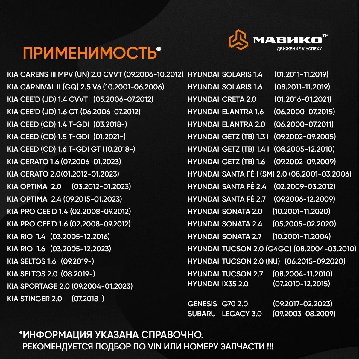 | Модель автомобиля | Genesis G70 / Hyundai Creta / Hyundai Elantra / Hyundai Getz / Hyundai Santa Fe / Hyundai Solaris / Hyundai Sonata / Hyundai Tucson / Hyundai ix35 / Kia Carens / Kia Carnival / Kia Ceed / Kia Cerato / Kia Rio / Kia Seltos / Kia Sportage / Kia Stinger / Pontiac Optima / Subaru Legacy |