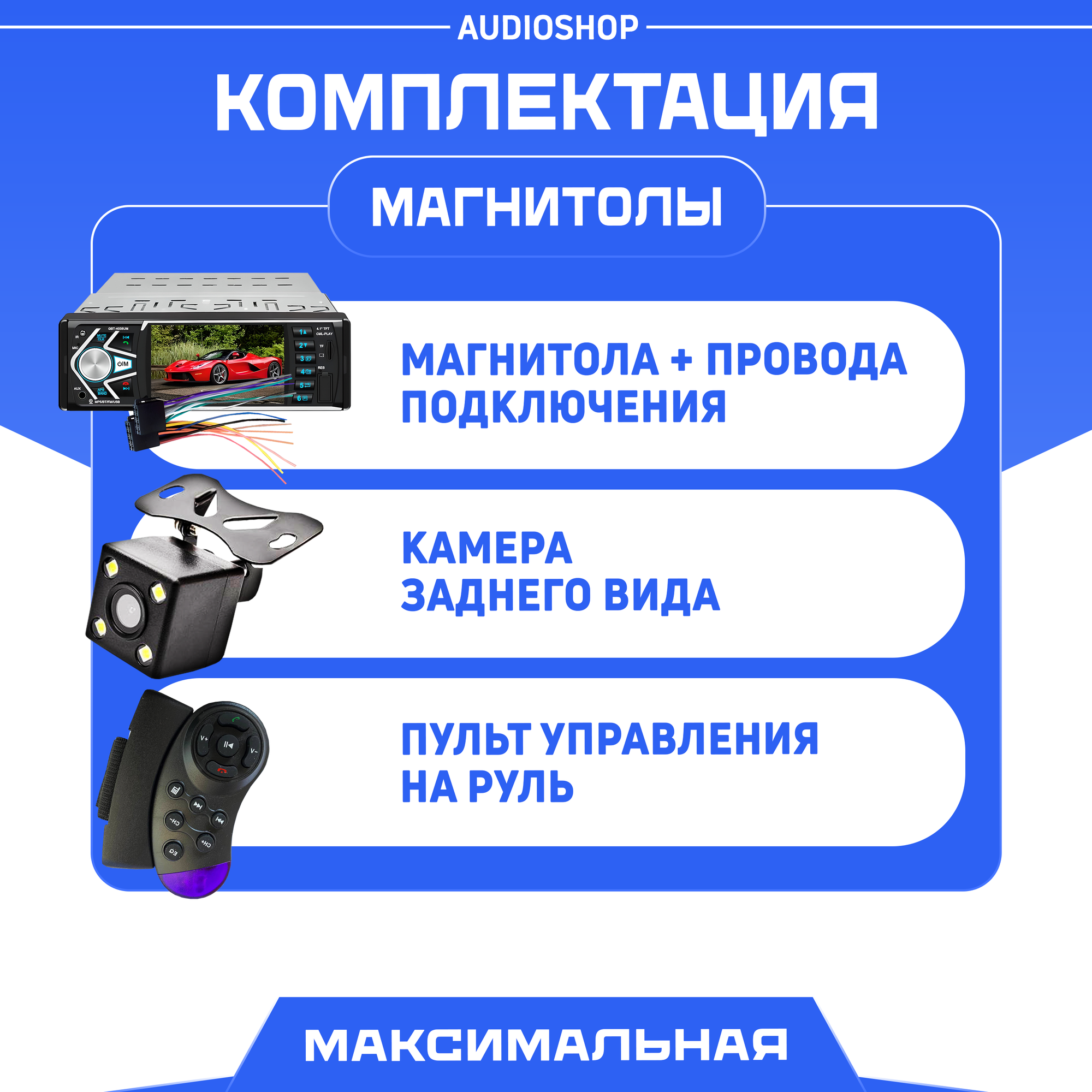 | Подробная комплектация | Магнитола, пульт ДУ, набор для установки, провода, камера заднего вида, инструкция |