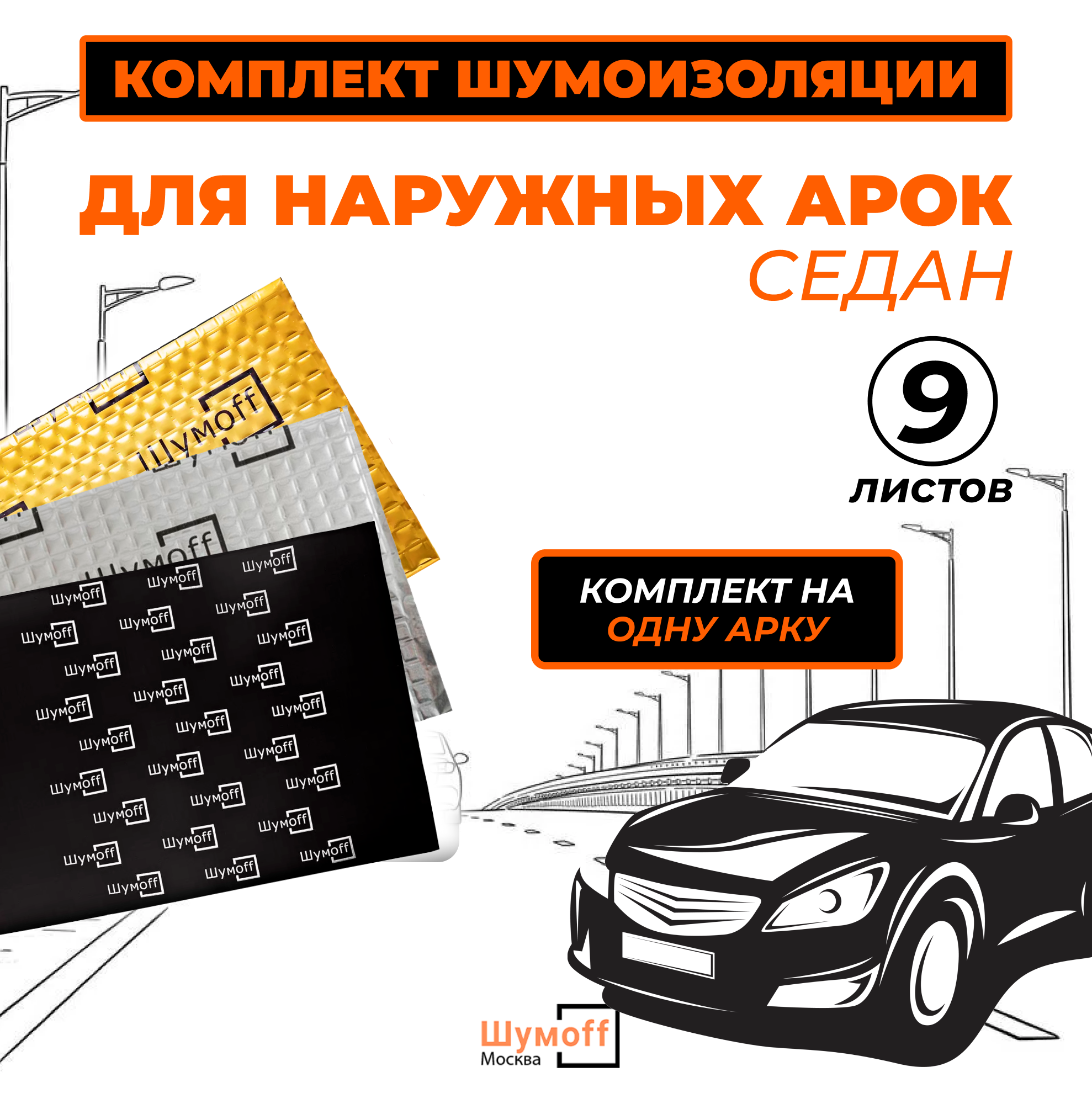 Купить Комплект шумоизоляции на 1 арку снаружи для автомобиля Седан. Виброизоляция Шумофф М2+М4, звукоизоляция Комфорт 3