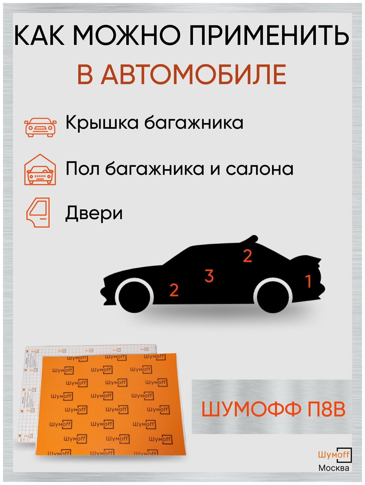 | Место применения | для багажника / для дверей / для капота / для пола / для потолка / теплоизоляция |