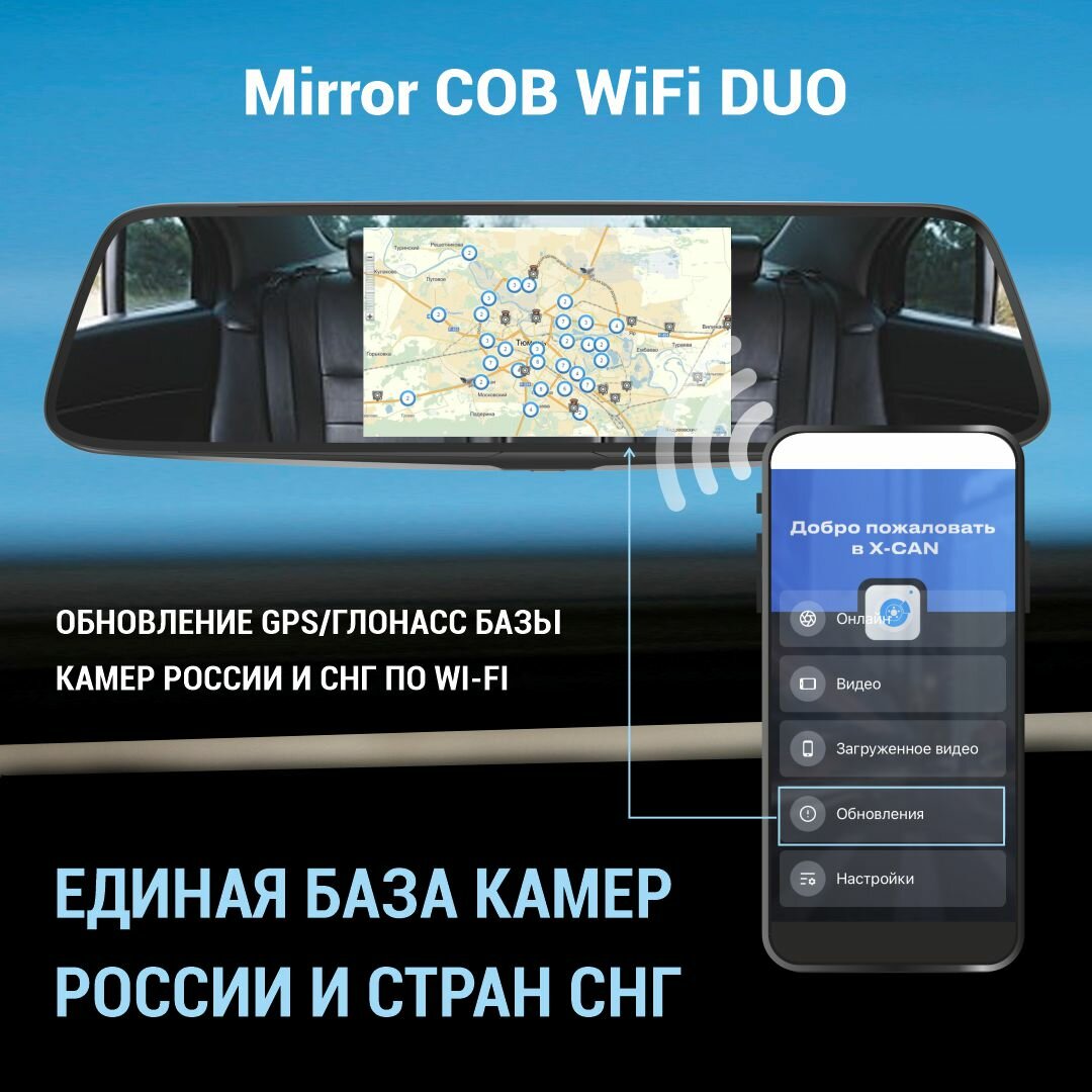 Видеорегистратор с радар-детектором в зеркале сигнатурный X-CAN Mirror COB WiFi Duo c GPS-информатором и сенсорным дисплеем интересное: