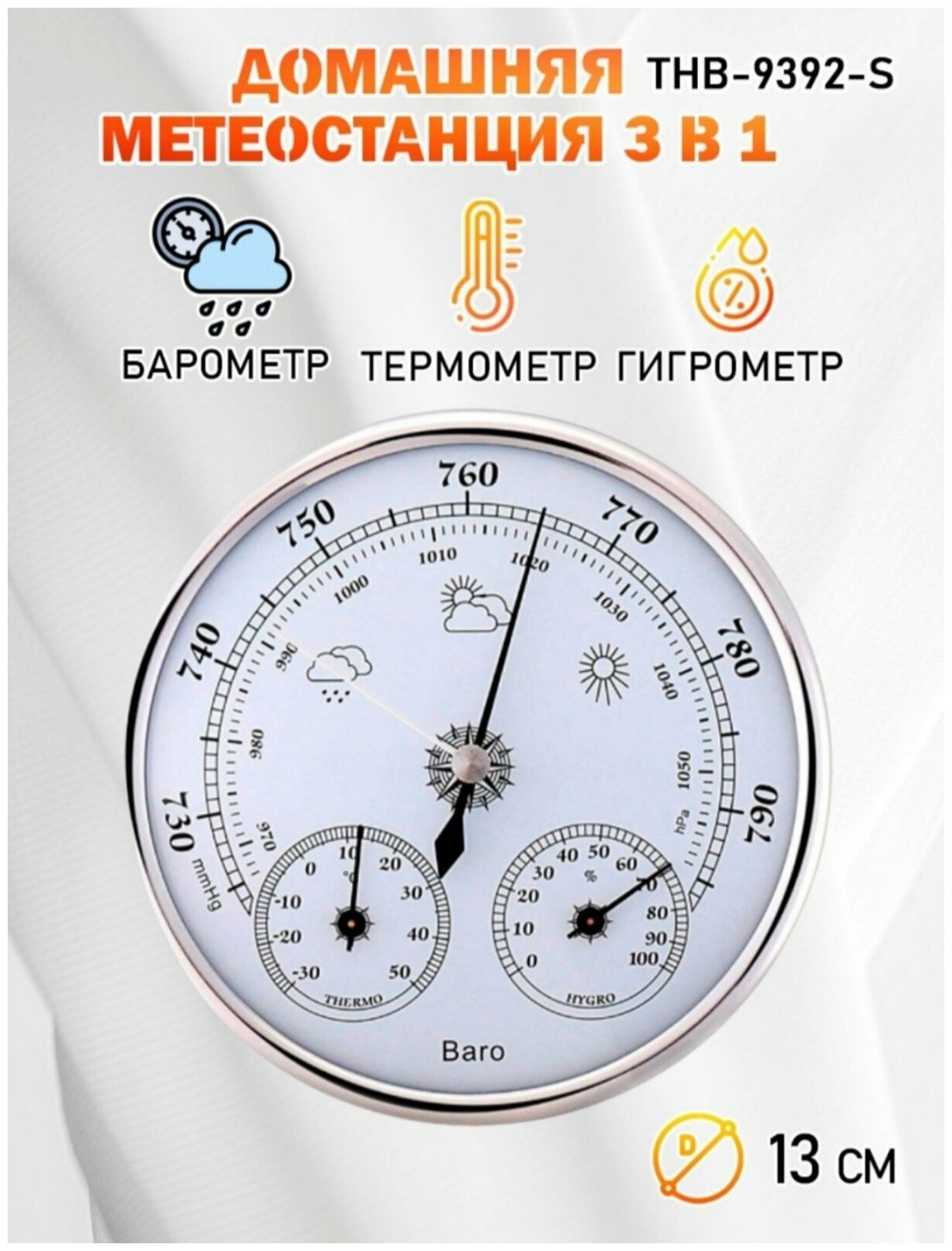 Барометр анероид THB 9392 S бытовой, диаметром 125 мм, 3 в 1 (барометр, термометр, гигрометр) - серебристый интересное: