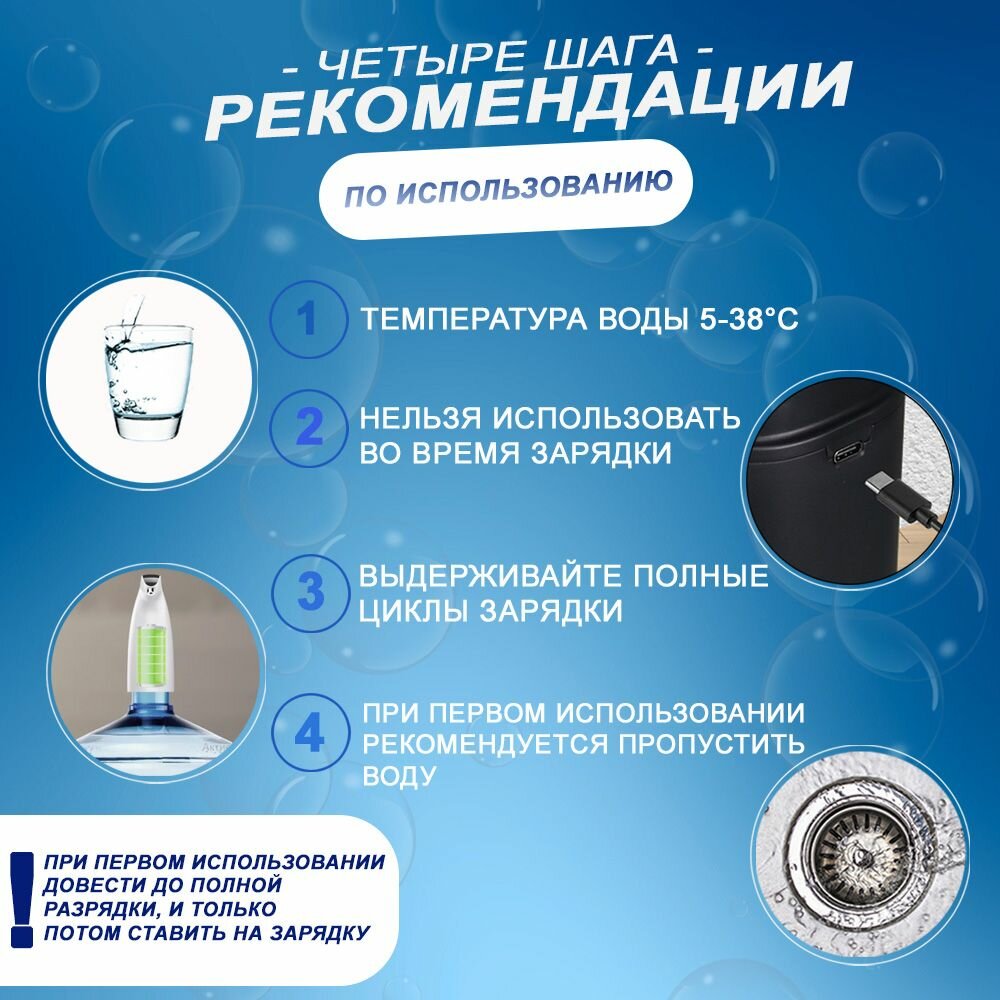 | Дополнительная информация | Электропомпа автоматическая с аккумулятором для бутилированной воды с двойным насосом и подсветкой. Комплектация: помпа для воды, кабель type-c, шланг (55 см) - 2шт., инструкция. |