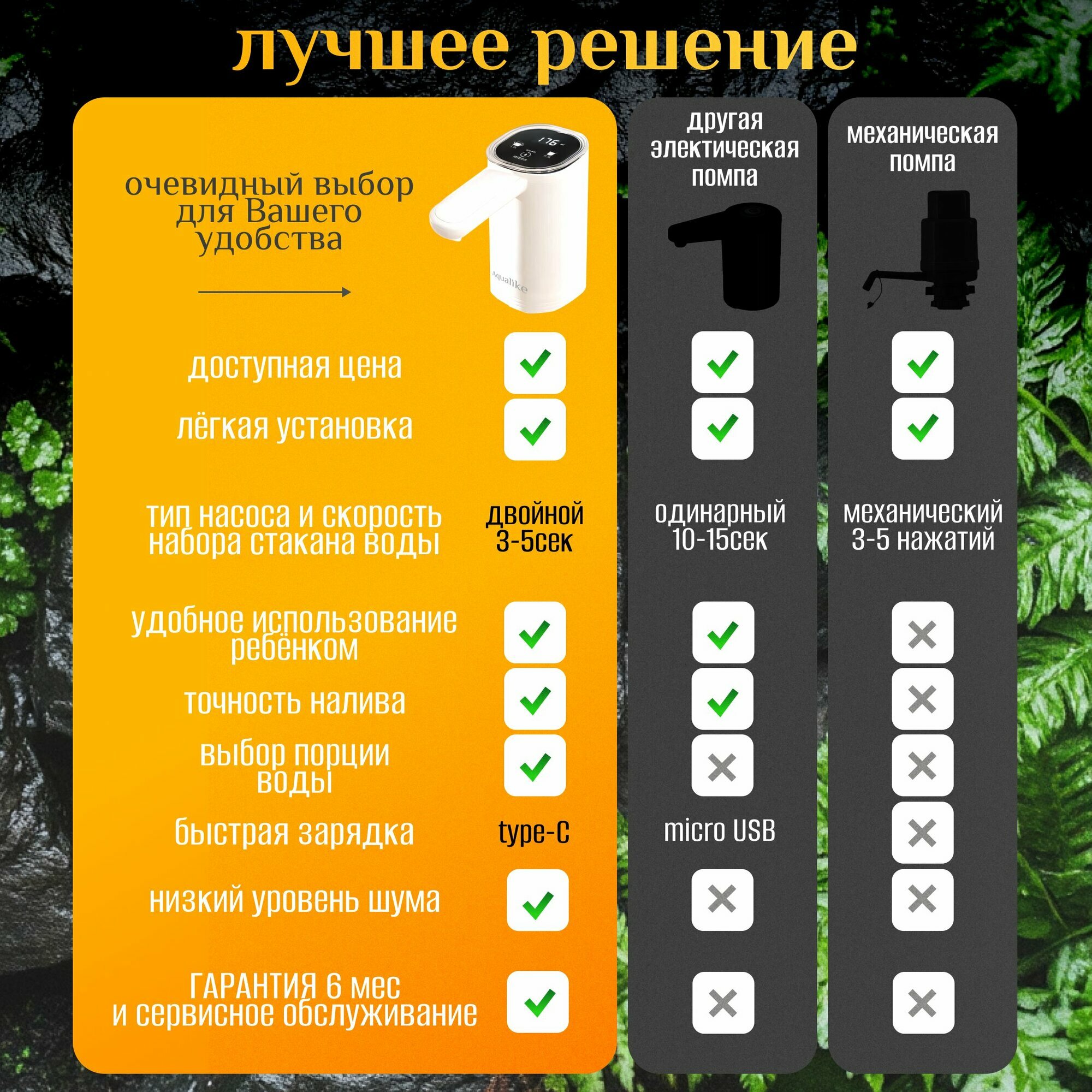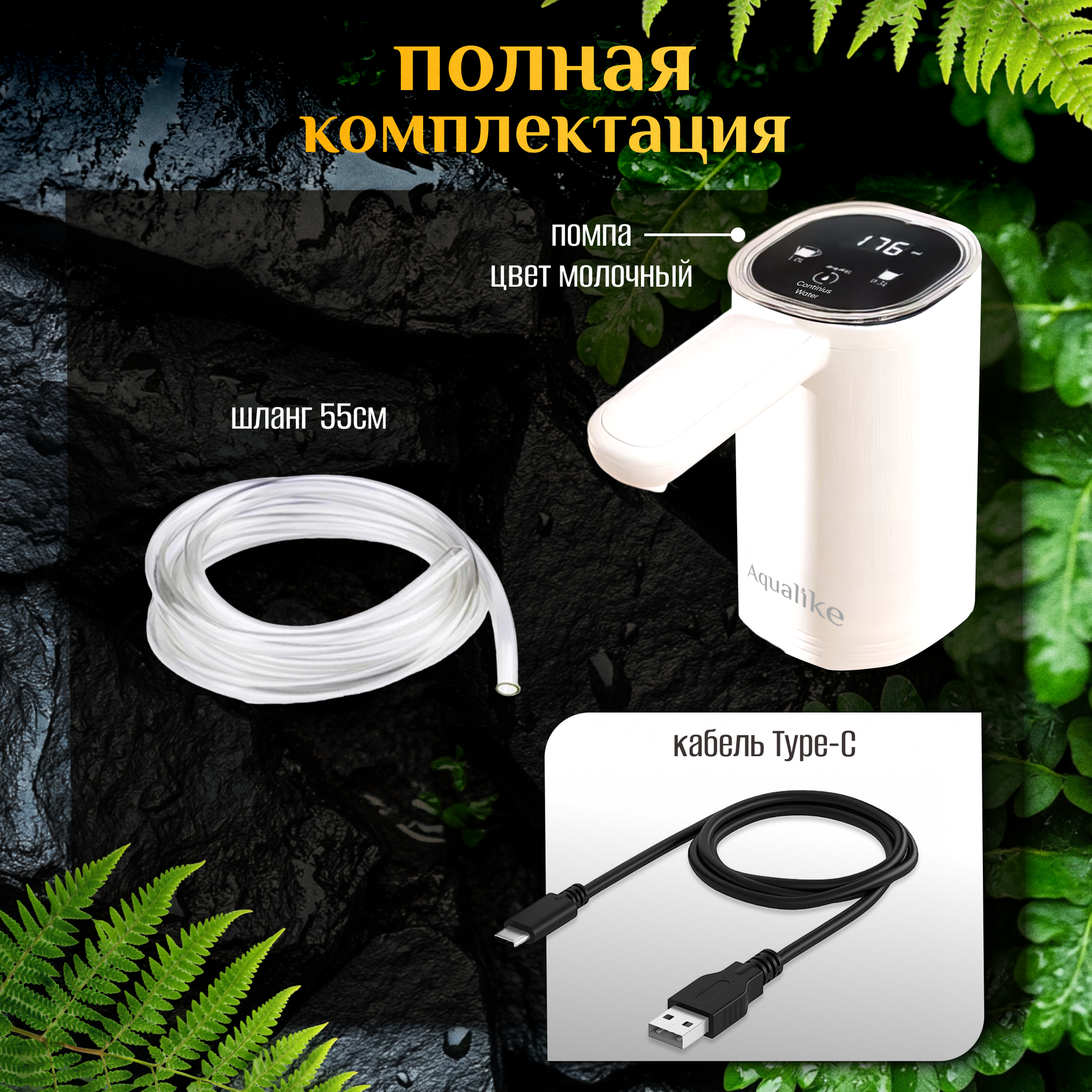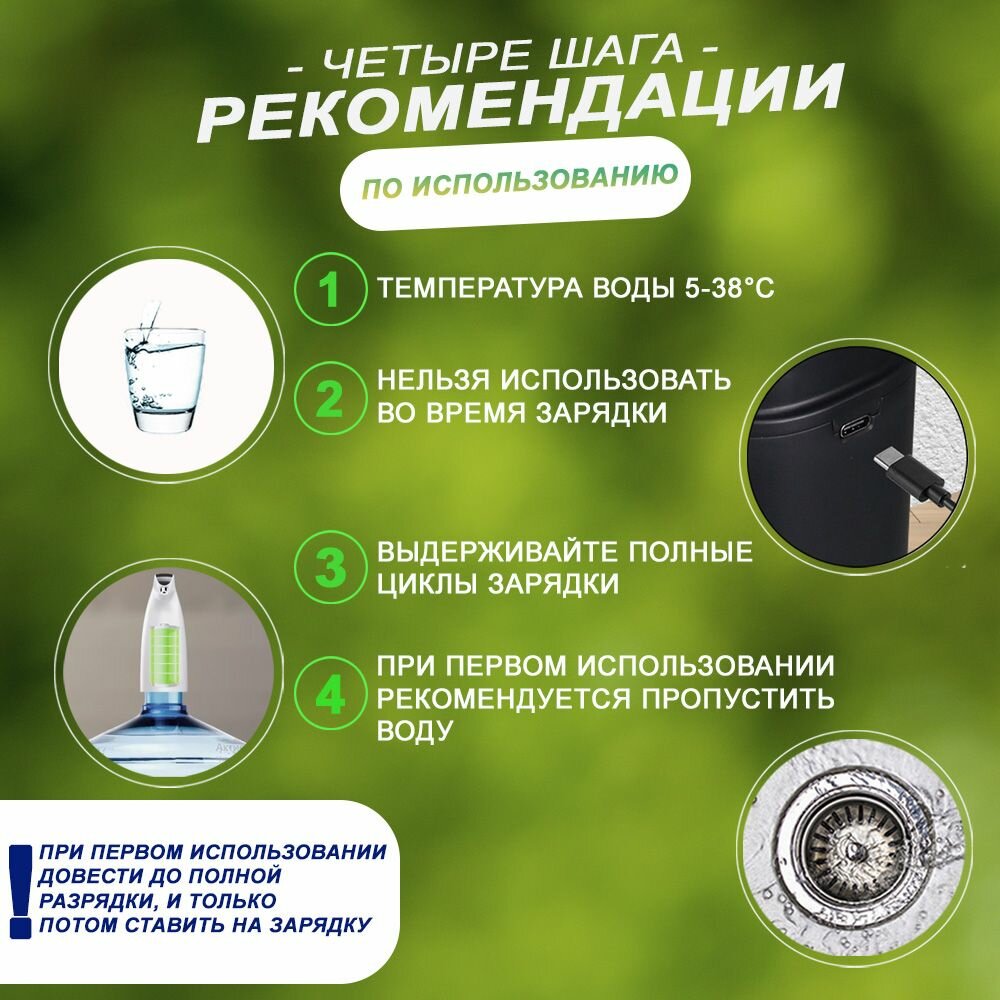 | Дополнительная информация | Электропомпа автоматическая с аккумулятором для бутилированной воды с двойным насосом и подсветкой. Комплектация: помпа для воды, кабель type-c, шланг (55 см) - 2шт., инструкция. |