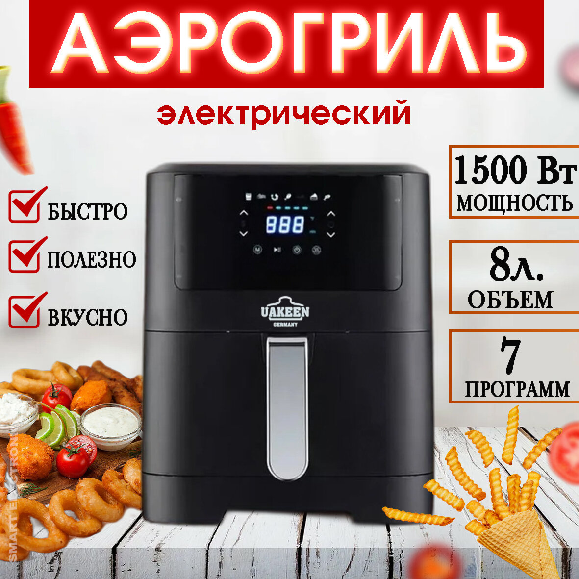 Купить Аэрогриль, аэрофритюрница, 8 л., 1500 Вт, 7 программ, жарка, запекание, обжаривание, гриль, черный