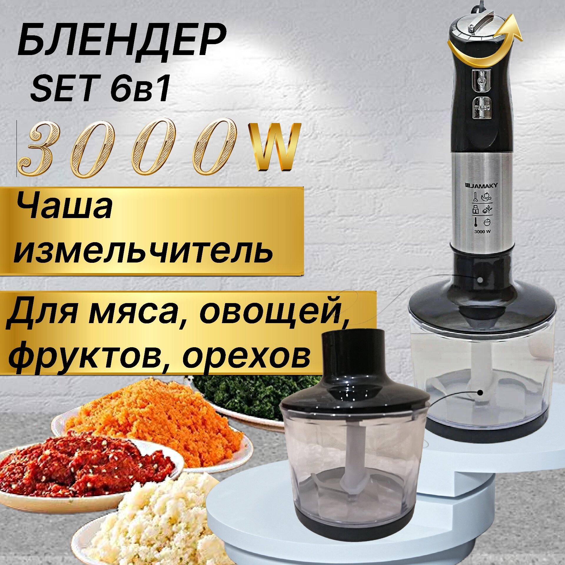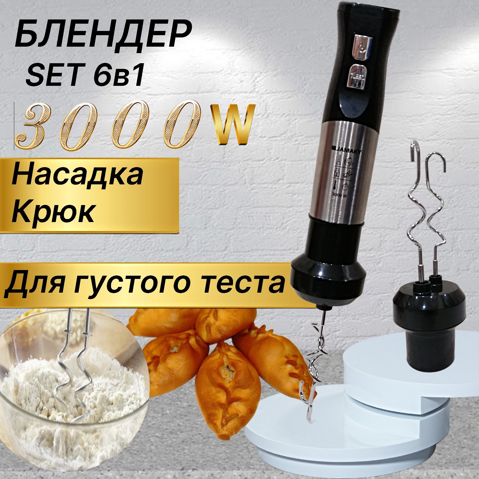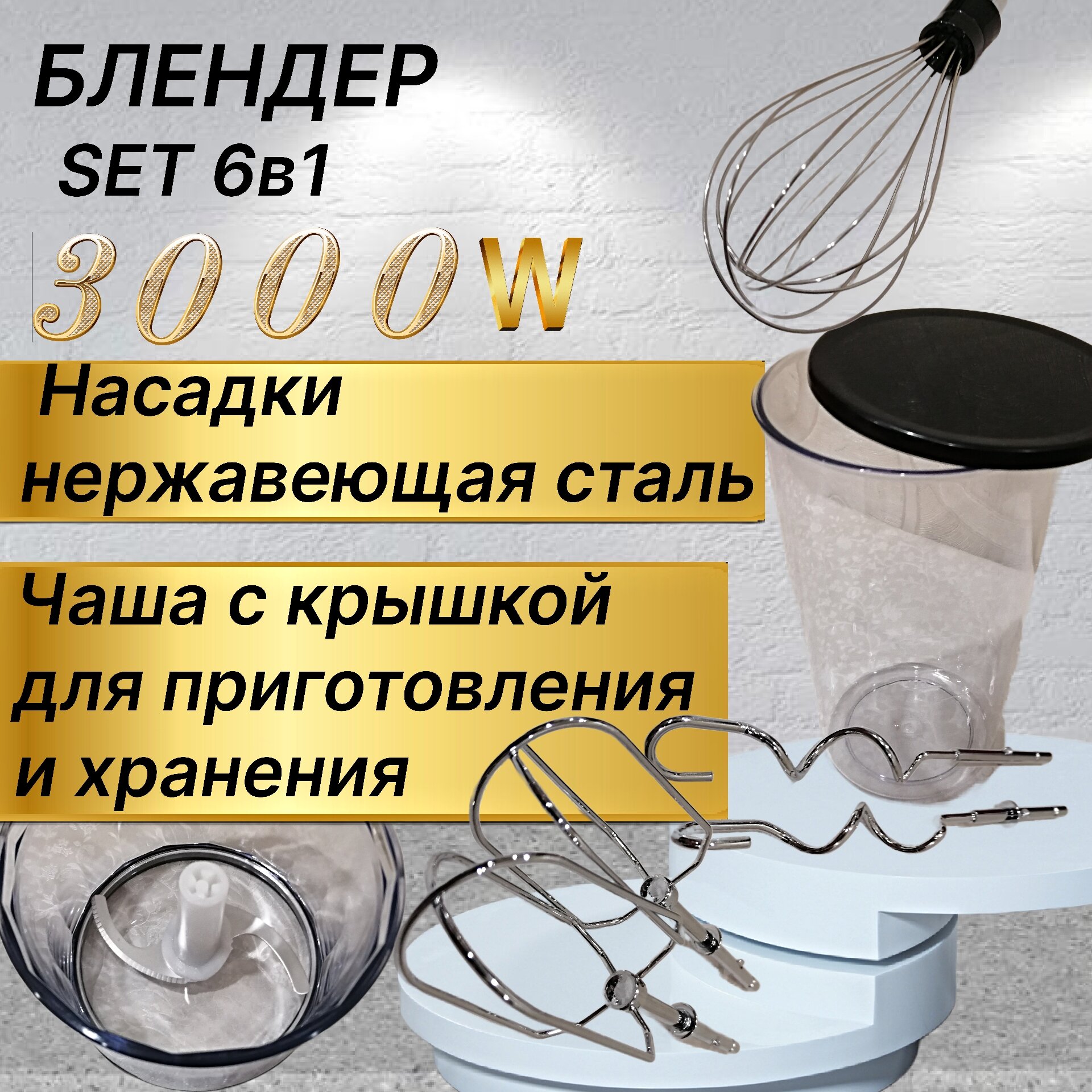 Измельчитель погружной для кухни, с комплектом насадок- венчик, миксер, крюк для теста / 6в1 Мощный блендер измельчитель 3000Вт интересное: