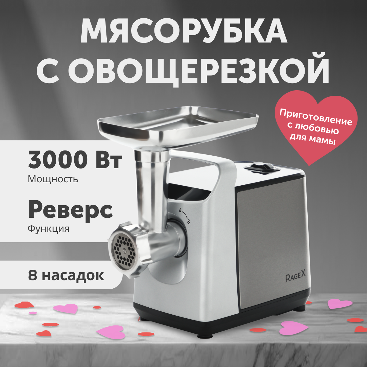 Электрическая мясорубка с овощерезкой, 1 скорость + реверс, 3000 Вт, серебристая интересное: