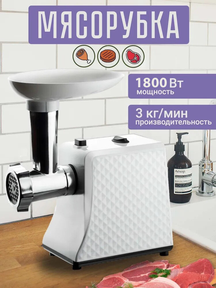 Мясорубка , мясорубка электрическая для фарша, белый,1800Вт, функция реверс,1 диск , насадки, домашняя электромясорубка