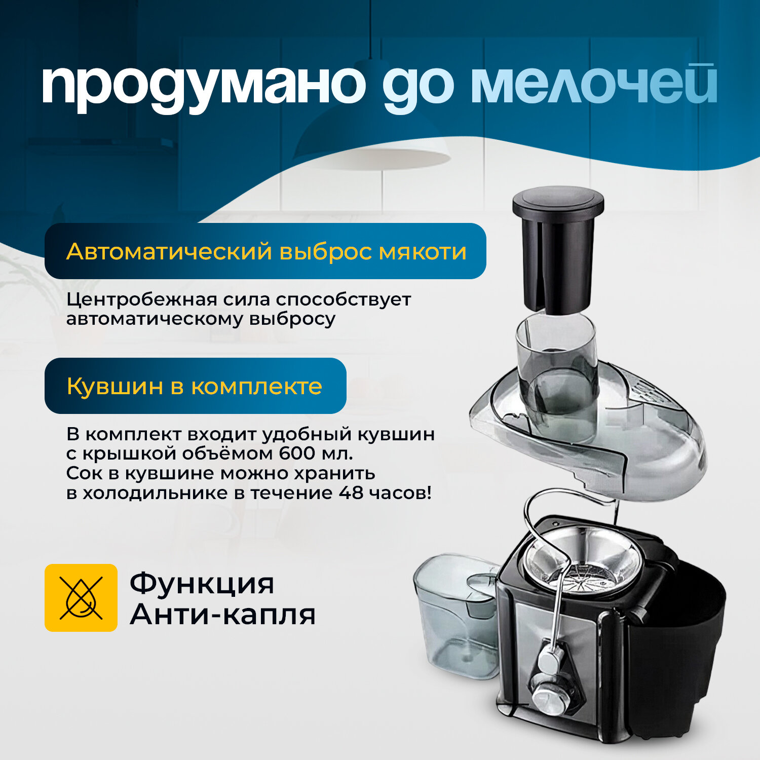| Особенности | автоматический выброс мякоти / защита от перегрузки / импульсный режим / плавный запуск двигателя / система «капля-стоп» / система прямой подачи сока |