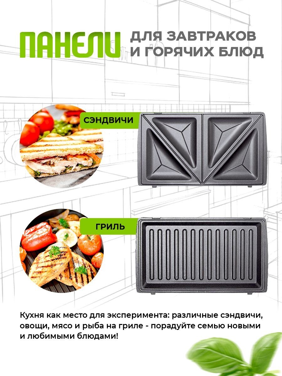 | Особенности | антипригарное покрытие, возможность смены панелей, защита от перегрева, индикатор работы, мытье в посудомоечной машине, сигнал об окончании приготовления |
